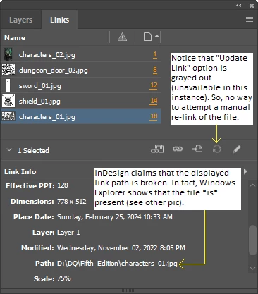 The short story is that InDesign claims that links for several Placed images (using File>Place) are broken; i.e. ID claims that the files are no longer in the linked locations and thus need to be re-linked. However, a quick check on Windows (10) File Explorer shows that said files are precisely where they need to be. I shall of course provide illustrations.