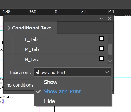 How to set show and print as indicator in conditional text for exporting using Javascript