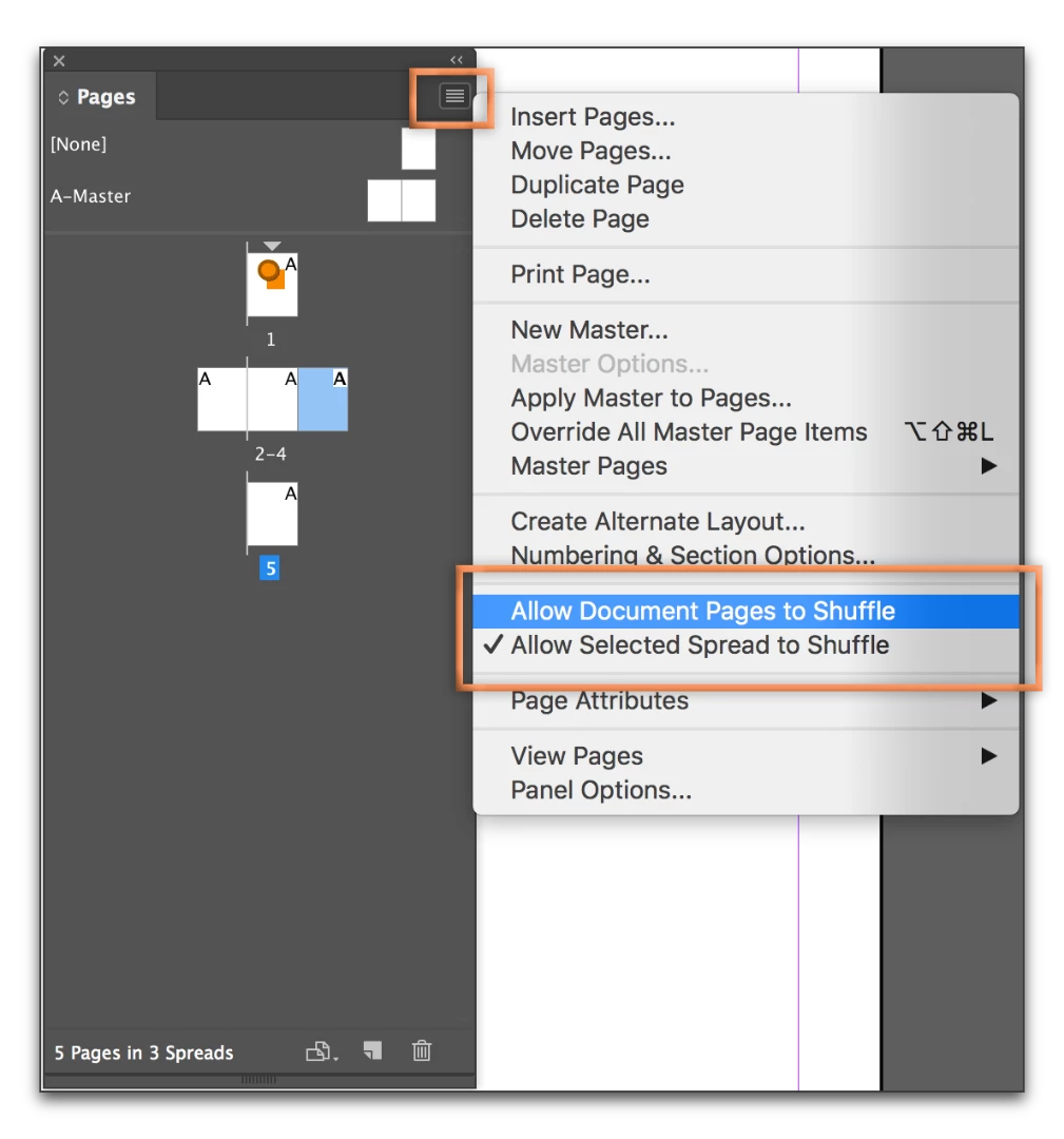 In the Pages panel, click on the first page, shift click the last page and go back to the Pages Panel one more time and make sure both commands outlined in orange have a checkmark in front of them.