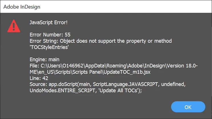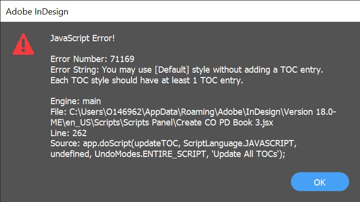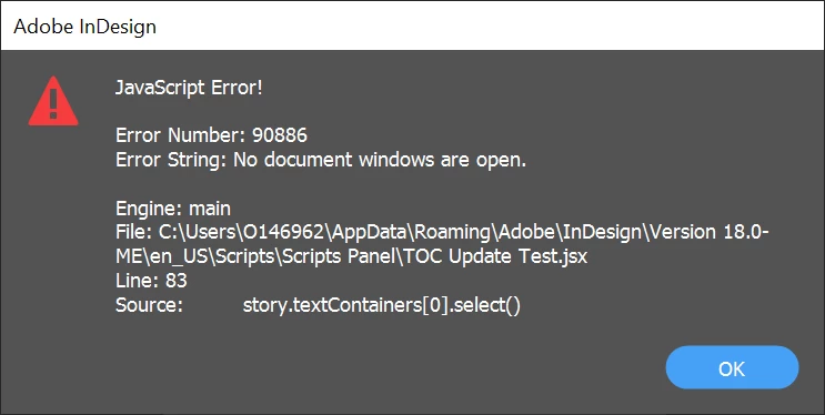 Part of my goal is to not have anything display while this script is running. (Still tring to figure out how to supress the book panel...) TO achieve that, I have opened the file, with the TOC I need to update, in the background. Unfortunately, when the script reaches "story.textContainers[0].select()" it fails, telling me me there is no document window open: