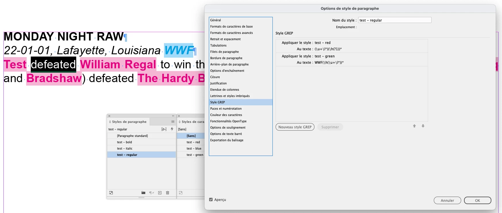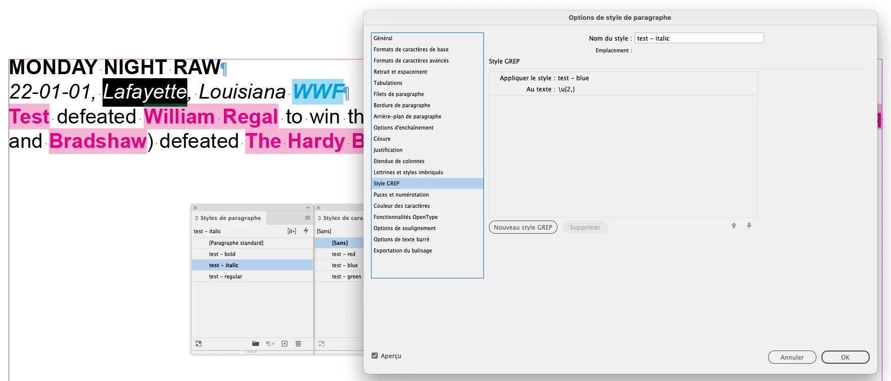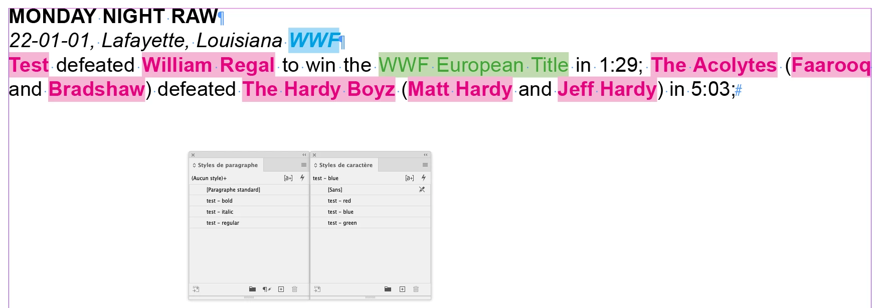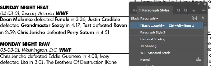 I've only recently started using InDesign for a company I'm working for and they use it to produce a wrestling almanac. One thing they do is highlight all the wrestler's names on a card in bold so a card may look something like this: