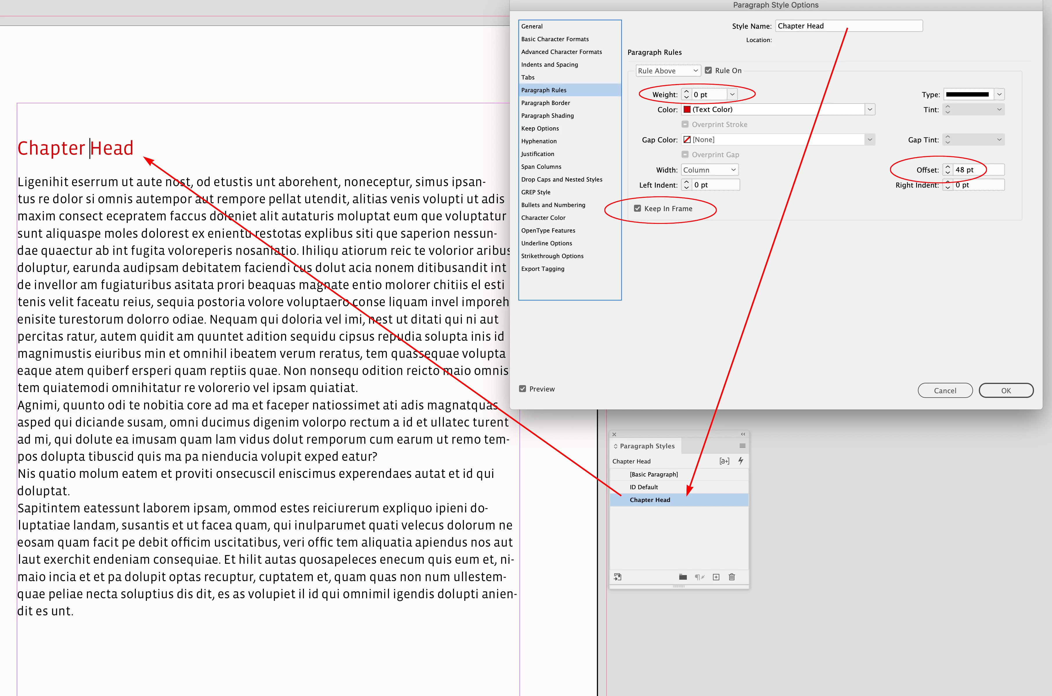 I want my chapter headings to start on a new page and begin four lines down from the top of the text frame. I know how to use “Keep options” and “Start paragraph on next page”, but I read in the InDesign guide that “If a paragraph begins at the top of a column or frame, InDesign does not honor the Space Before value.” It continues: “In such a case, you can increase the leading of the first line of the paragraph or increase the top inset of the text frame in InDesign.” I don’t understand what this means, it doesn’t seem to work for me.