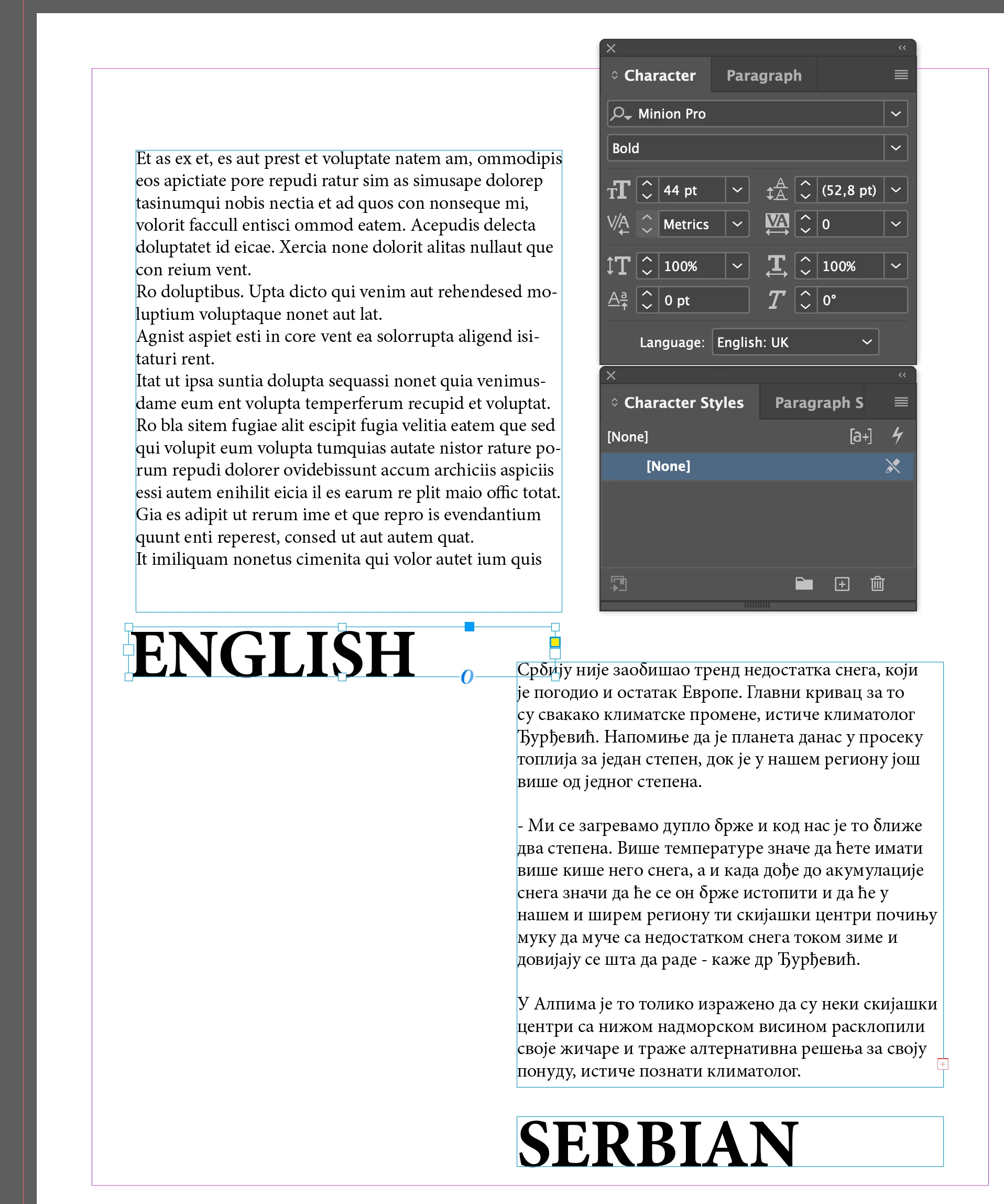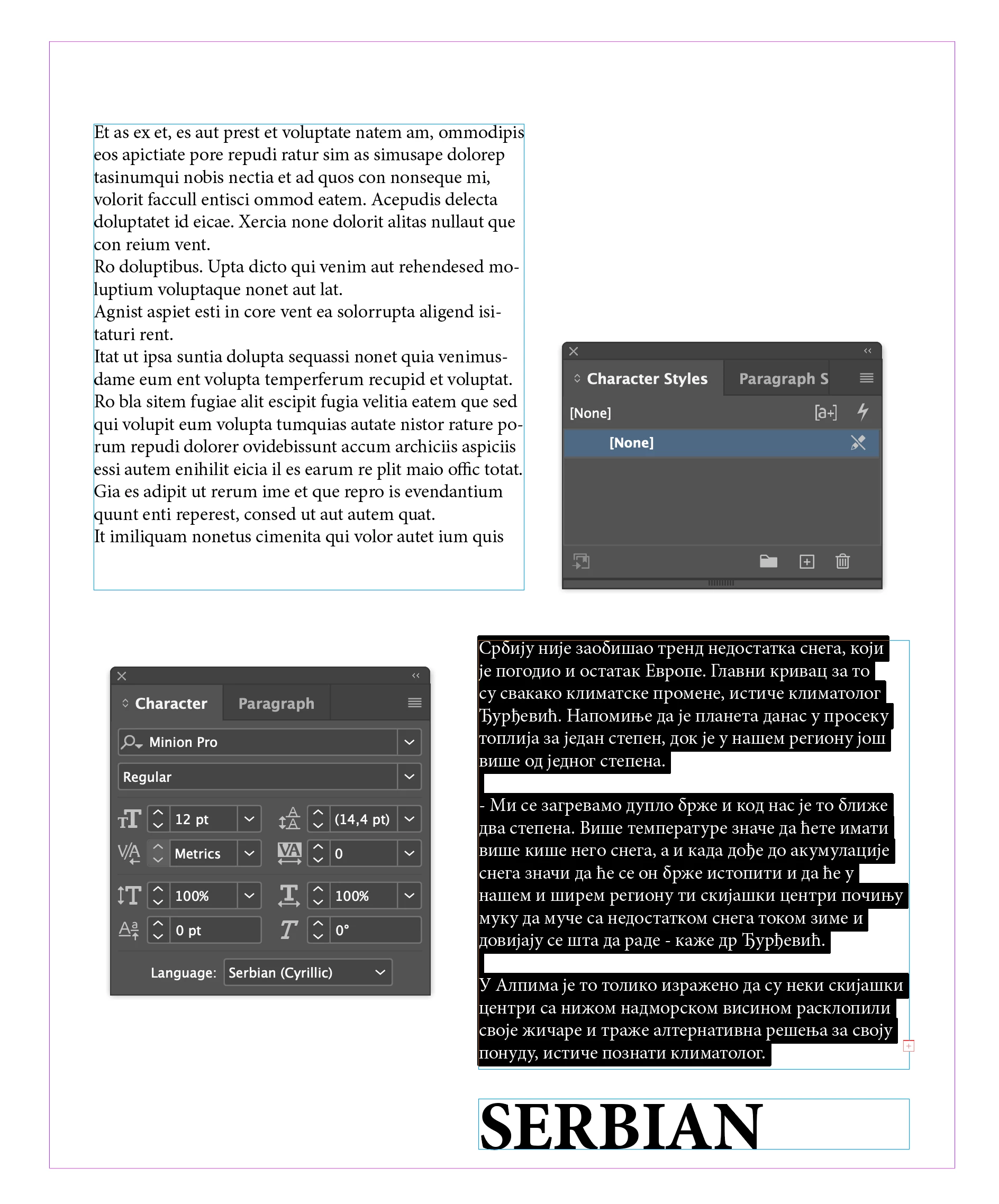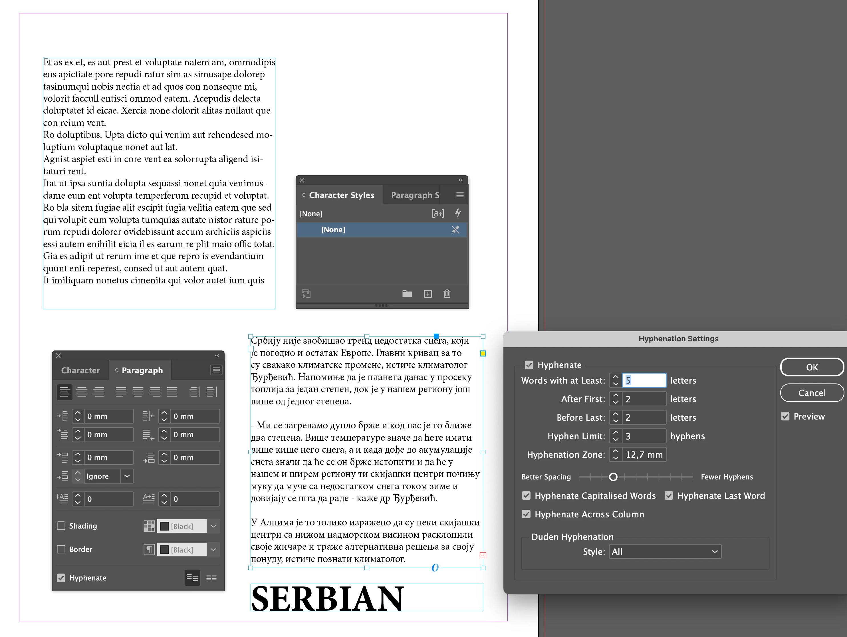 I am reaching out to request assistance with a persistent issue I am experiencing with hyphenation in InDesign, particularly when working with both Cyrillic and Latin scripts in the Serbian language. Despite ensuring that dictionaries are correctly installed and configured, the hyphenation function fails to operate as expected. This issue is not limited to Serbian; I have also encountered problems with English hyphenation. However, when I adjust the settings to use the Proximity method, English hyphenation resumes normal function, an adjustment that, regrettably, does not resolve the issue for Serbian.
