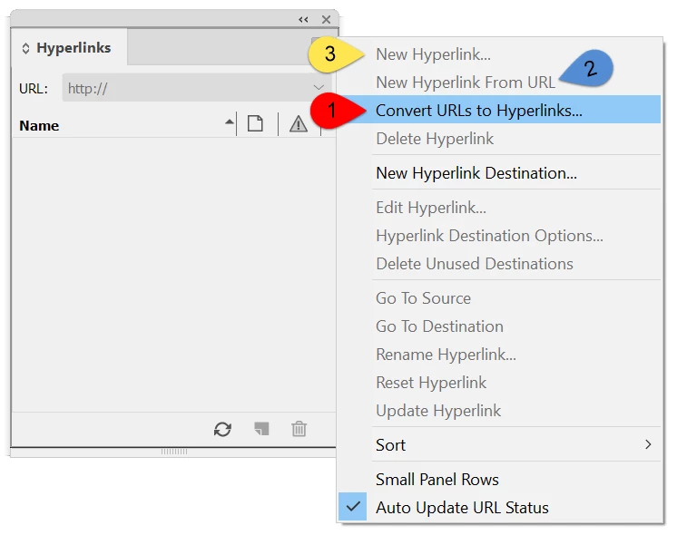 Review of the hyperlinks panel's options: