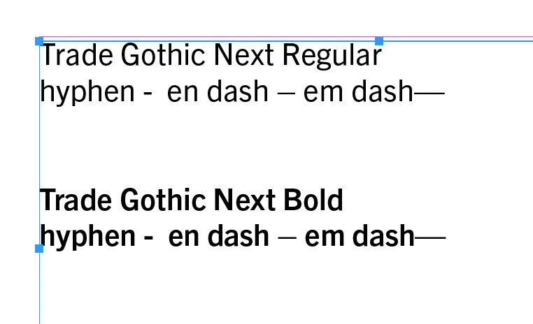 I've started using Trade Gothic Next from Adobe fonts and when I type a hyphen, it gives me an en dash. It also generates en dashes for all end-of-line hyphenated words. I can go into glyphs to change them from en dashes to hyphens but that would mean going through all my body copy in Trade Gothic Next for all uses of the en dash. That's crazy! I don't have this problem with other Adobe fonts I'm using. What's going on?