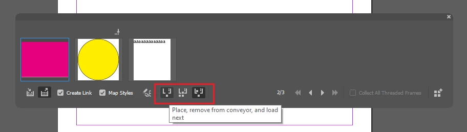 Opening this "tool" reveals a panel with a bunch of thumbnails on it. I may have loaded the "conveyor" with all items from a document in my first experiment with it. Clicking on the thumbnails on this conveyor does nothing. Selecting an item on a page and attempting to "load" the conveyor from the selection does nothing. There's no apparent way to remove stuff from the conveyor.