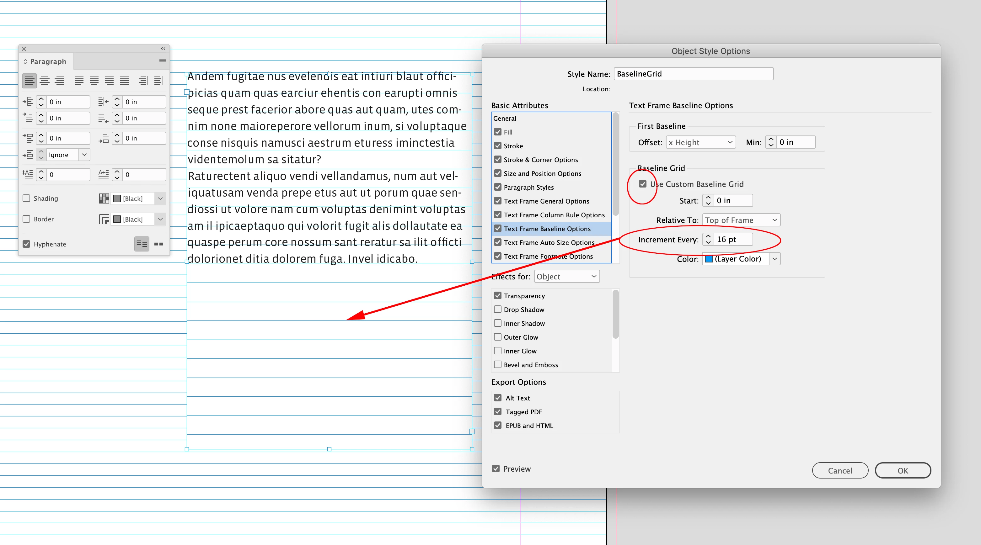 Here my document‘s grid is set to 10pt, and my Text Frame’s Object Style is set to 16pt:
