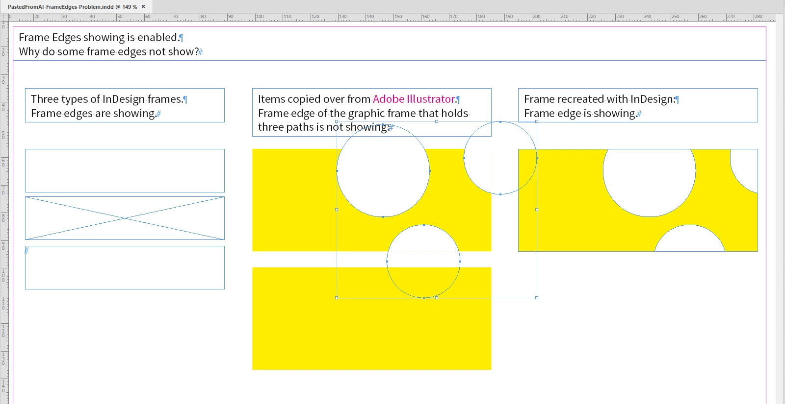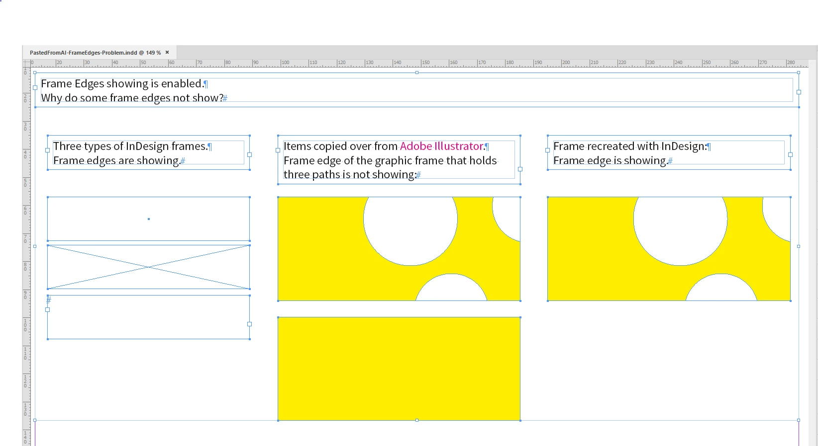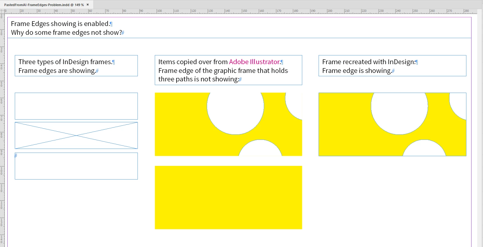 In a specific InDesign document, the frames have stopped showing as frames and are now "invisible" boxes - yes, I can click on them and place objects within their boundaries still, but it's not as user-friendly when the "x" within the frame's boundaries is missing as it's harder to see and therefore remember where the frame was if I need to change anything.