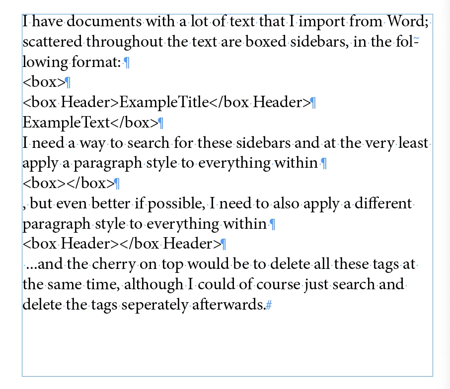 I have documents with a lot of text that I import from Word; scattered throughout the text are boxed sidebars, in the following format: <box><box Header>ExampleTitle</box Header>ExampleText</box>