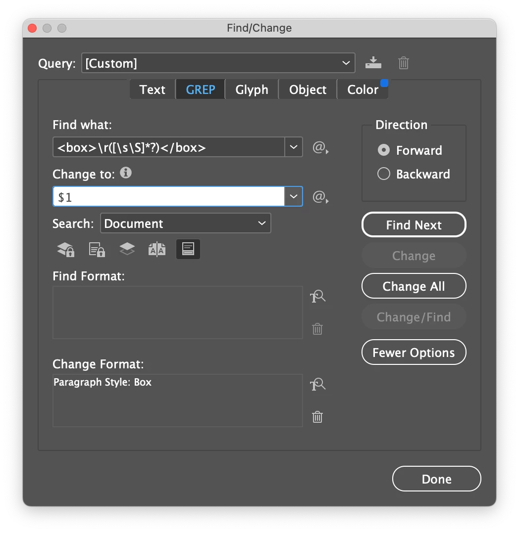 I need a way to search for these sidebars and at the very least apply a paragraph style to everything within <box></box>, but even better if possible, I need to also apply a different paragraph style to everything within <box Header></box Header> ...and the cherry on top would be to delete all these tags at the same time, although I could of course just search and delete the tags seperately afterwards.