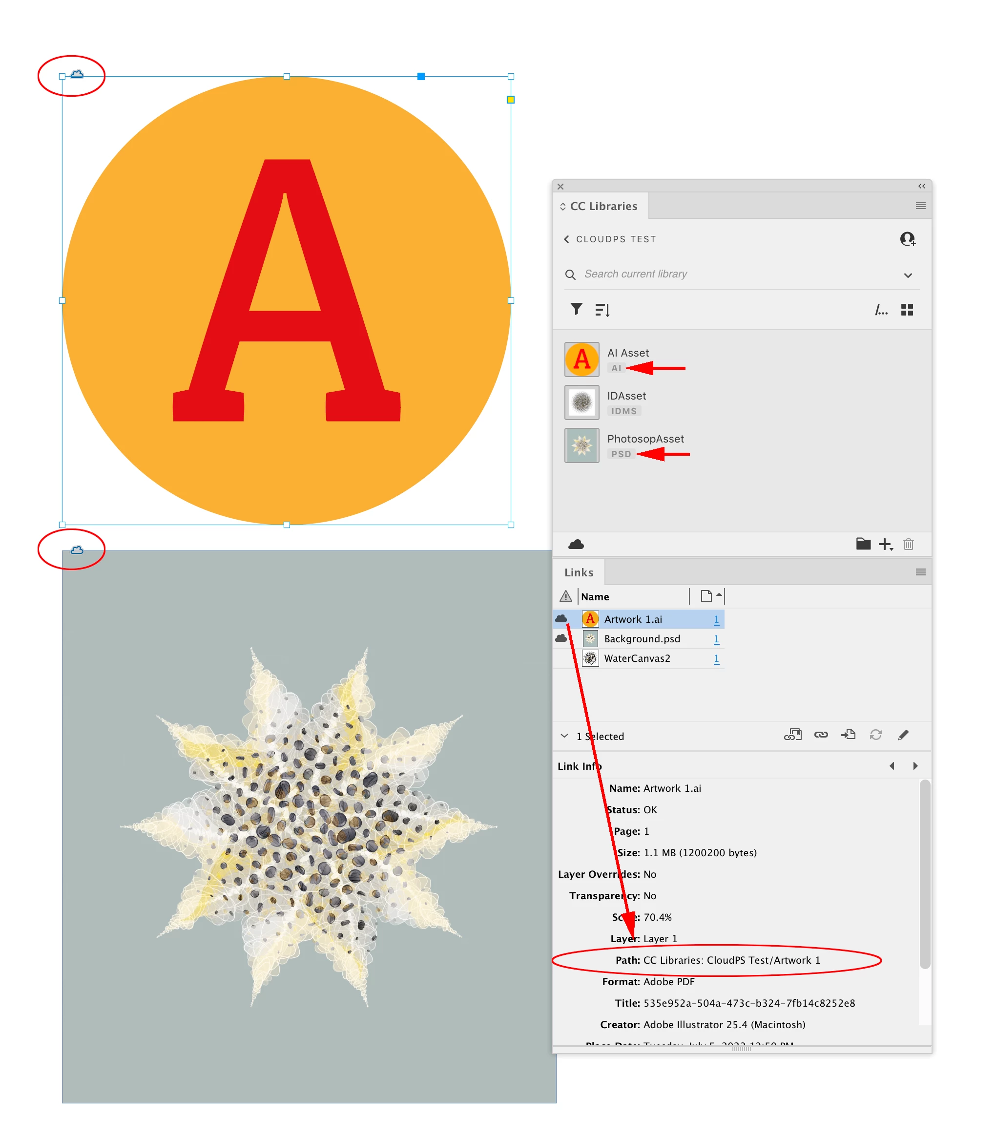 If the art is added to the CC Library from the app that created it (Photoshop or Illustrator), it will be a Cloud link when you drag it on to an ID page. For example these two CC Library items are listed as AI and PSD. When I drag them on to the page, the link shows a cloud icon and the Path contains a CC Libraries prefix indicating it’s to the shared CC Library: