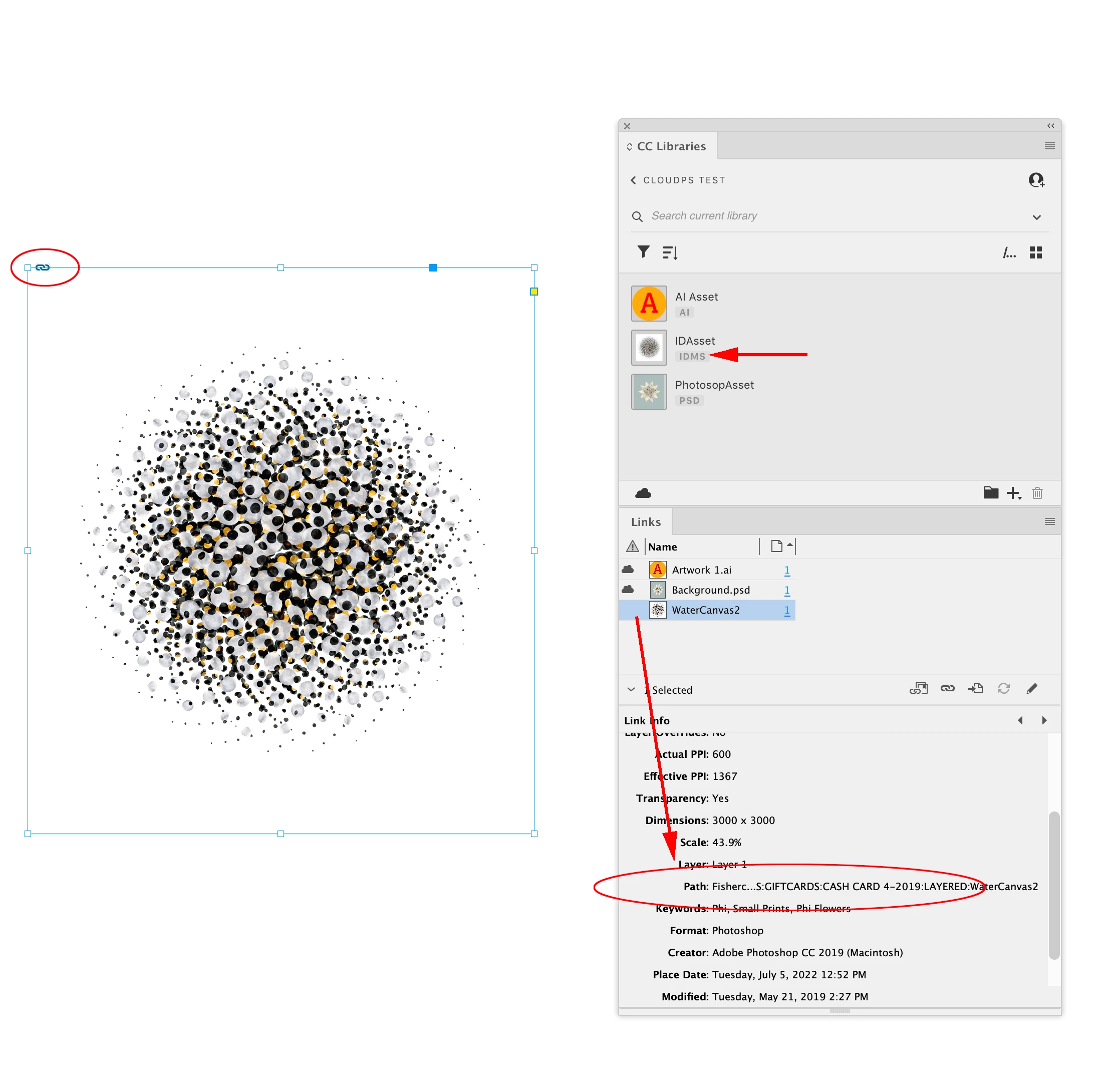 If the asset was created by placing a locally saved image on a page, and dragging into the CC Library, it’s listed as an IDMS asset. When the IDMS asset is dragged on to a page, it gets a regular local chain icon, and the Path is to my local volume not the cloud. This link would break on a remote computer with a different CC account.