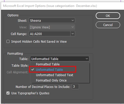 I am getting errors when there is a formula behind text in the table. If the formula results in a number, the number is imported and there is no problem....but if the formula results in text, the cell will be blank or a '-1' appears.