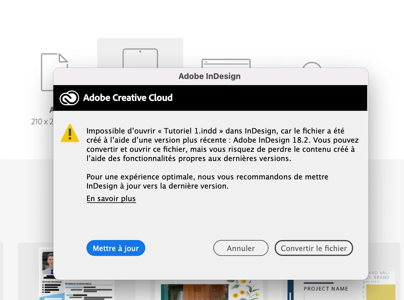 Depuis de récentes mises à jour, je ne parviens plus toujours à ouvrir mes fichiers InDesign. Message d'erreur ! Quelqu'un peut-il me donner la solution ? Merci !!!