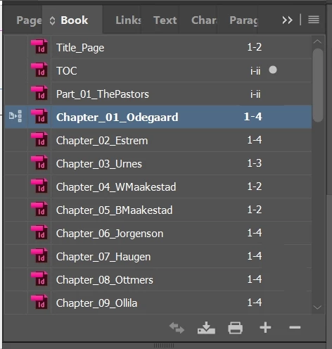 The screen capture below shows the current number of pages in each document/chapter. In ALL examples I see, it would be Chapter 01 would be 1-4, Chapter 02 would be 5-8, Chapter 03 would be 9-11, etc.