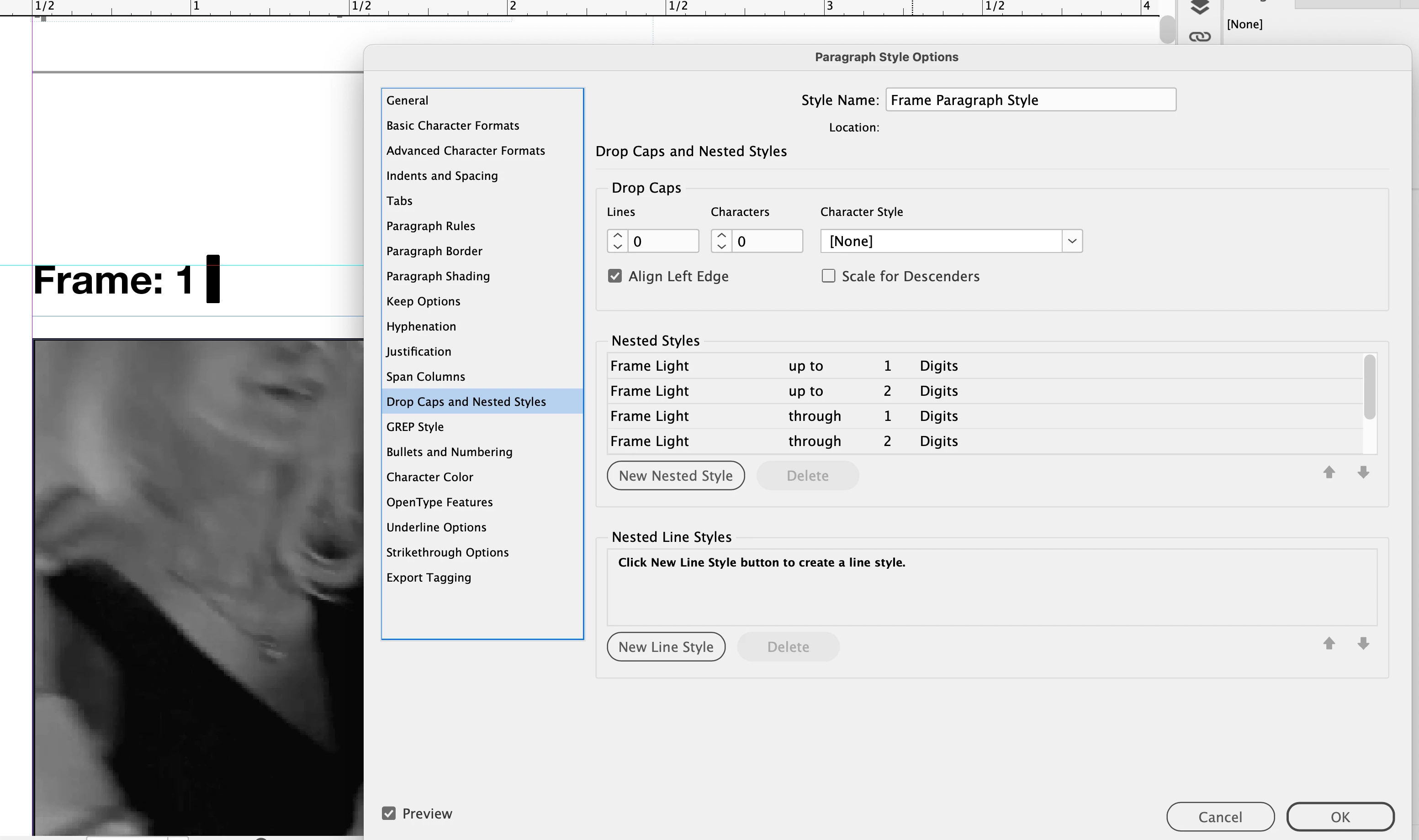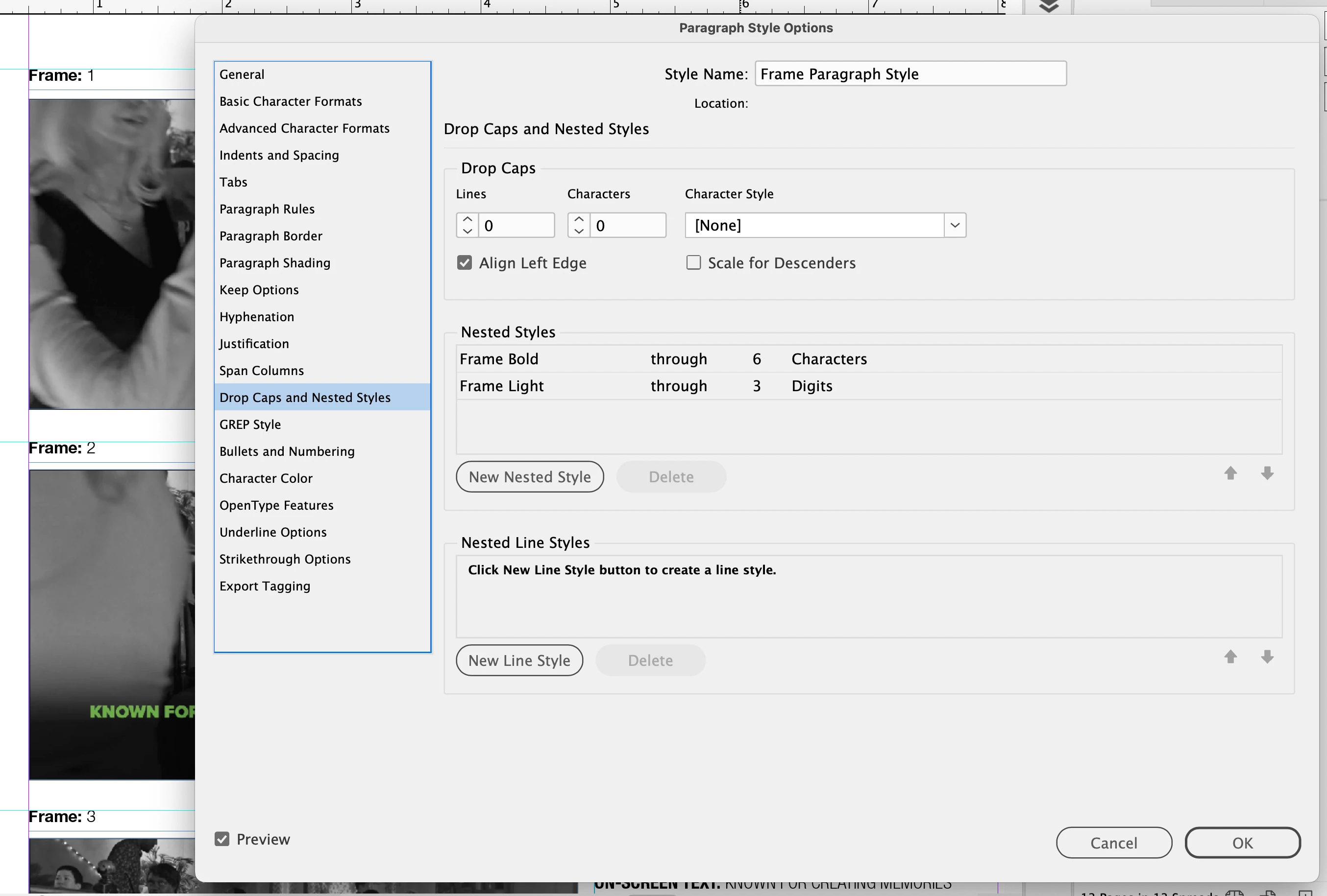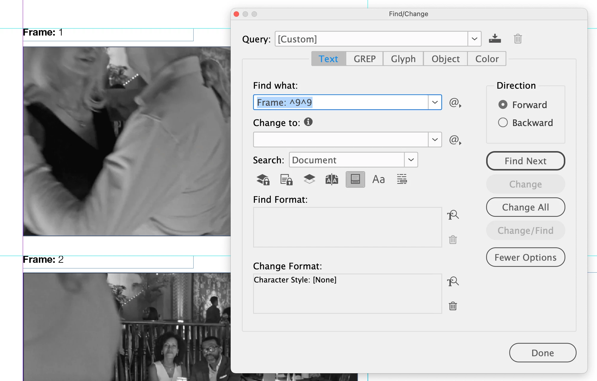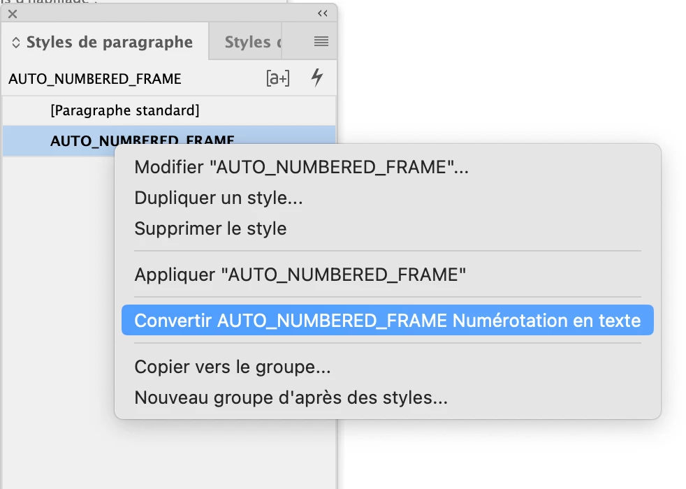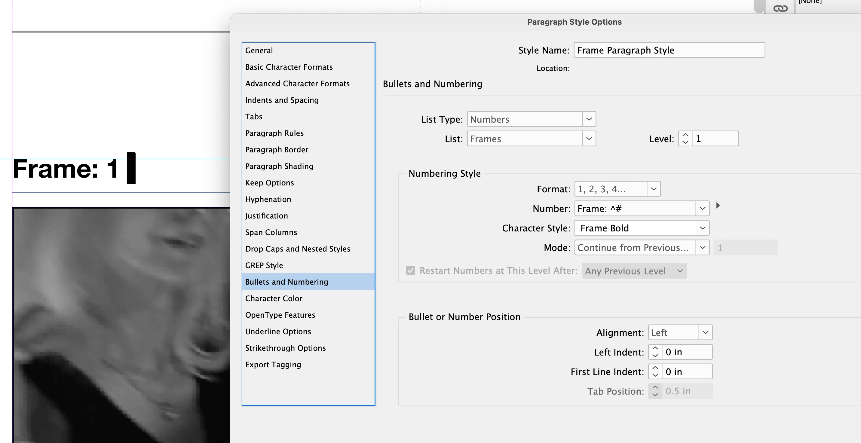 I have a series of images on a page, with text above them numbered "Frame: 1, Frame: 2, etc" which are generated automatically by styling a space within the text box, using a Paragraph style, via Bullets and Numbering.