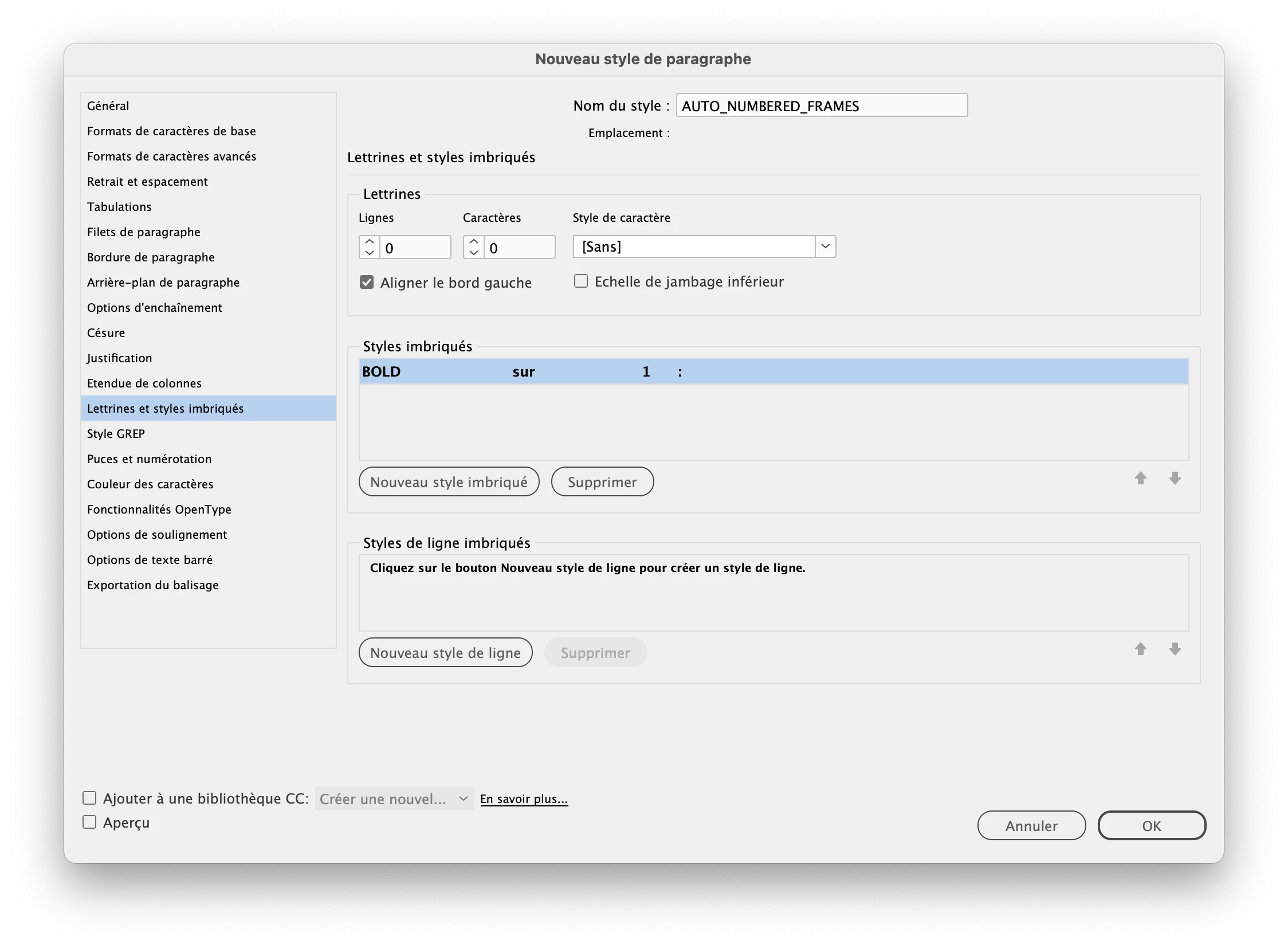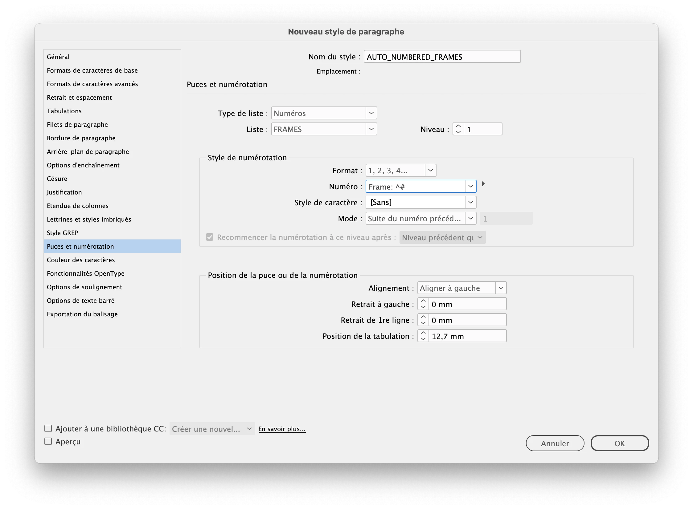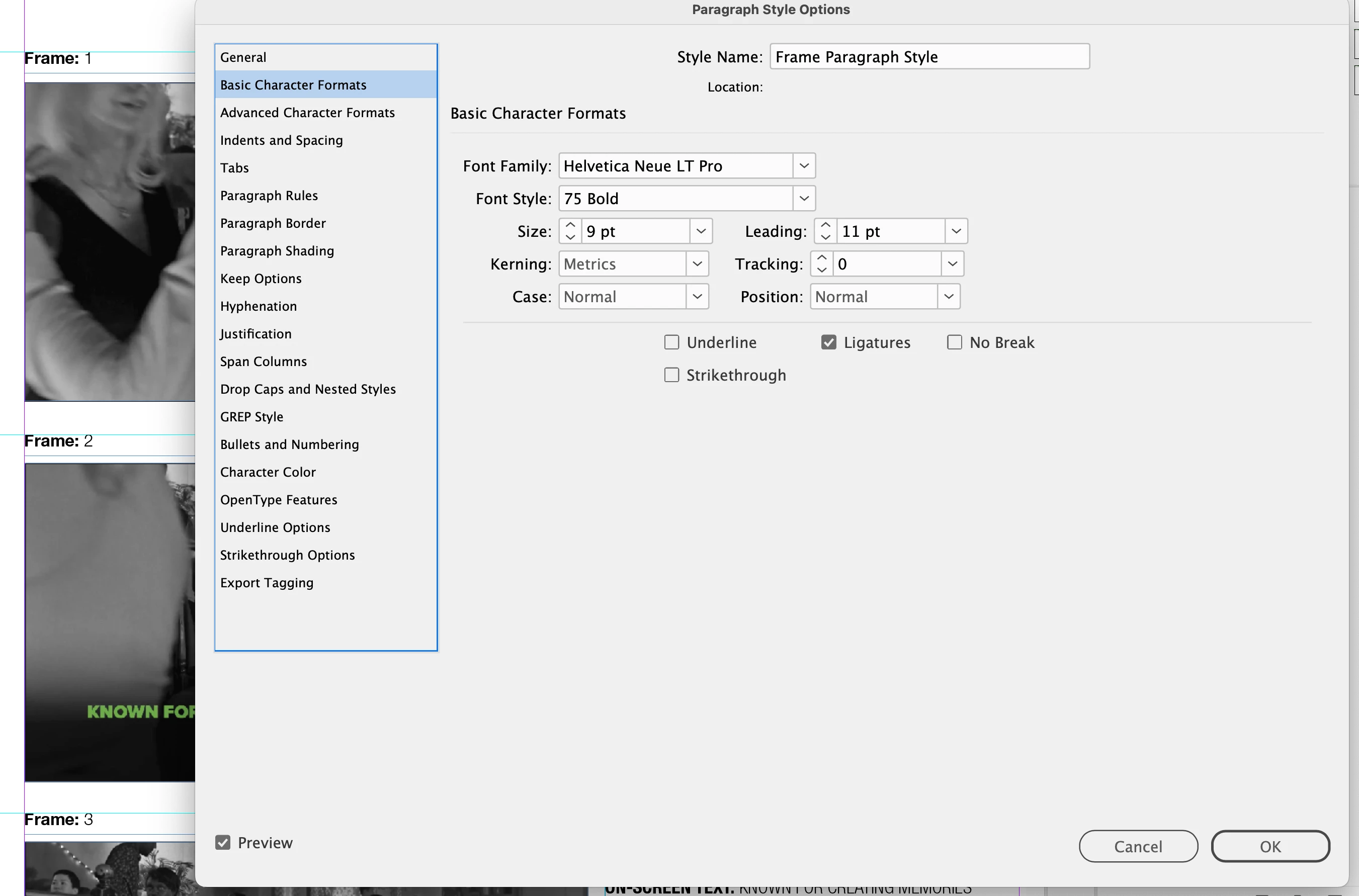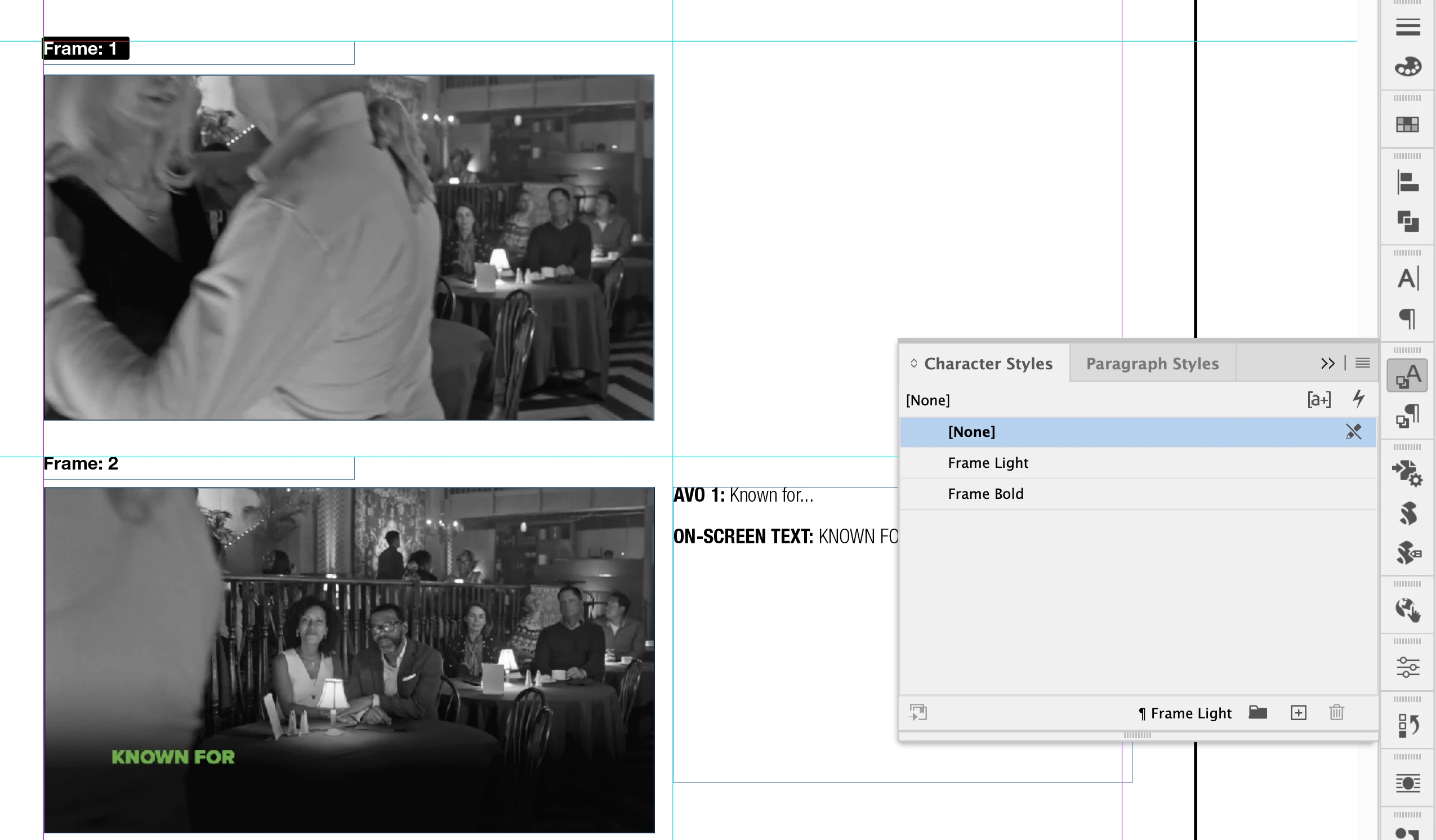 I have a series of images on a page, with text above them numbered "Frame: 1, Frame: 2, etc" which are generated automatically by styling a space within the text box, using a Paragraph style, via Bullets and Numbering.