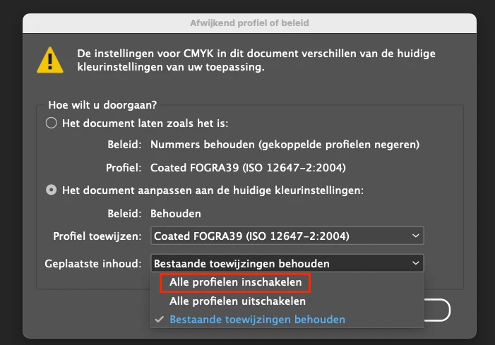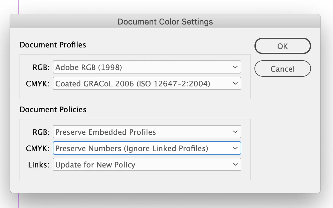 Currently most documents have 'include profiles' for RGB and 'preserve numbers' for CMYK. As this is the standard color settings.