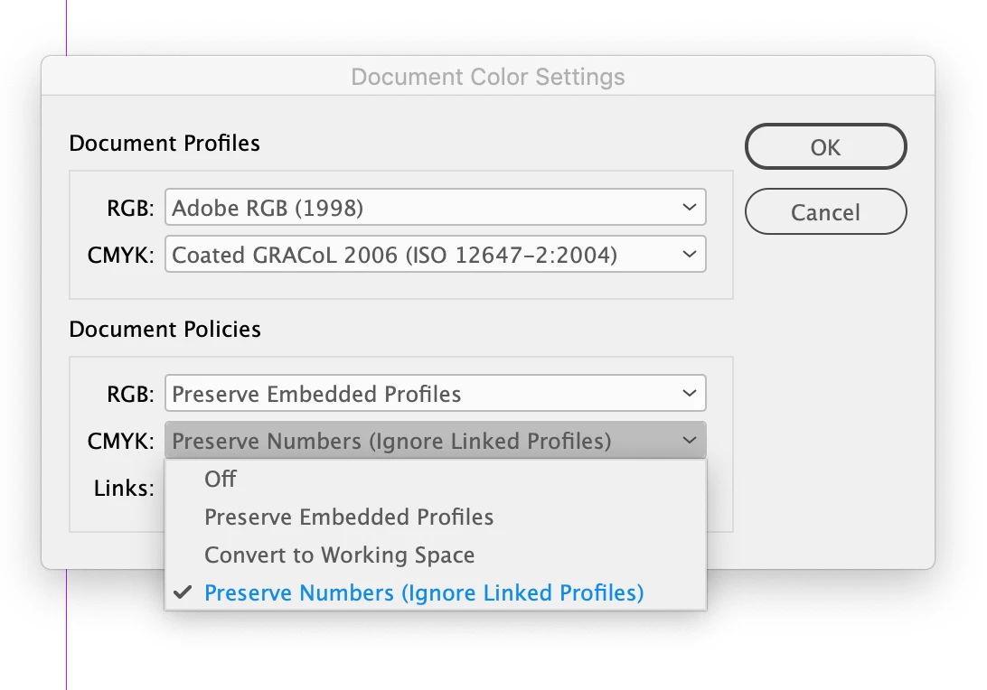 I want to turn on 'include profiles' for CMYK on existing documents.