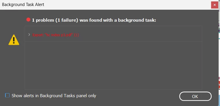 andreas18285213Known ParticipantForum|Forum|3 years agoJanuary 12, 2023Questionindd 18.1 failing exportForum|Forum|3 years agoJanuary 12, 20231 reply177 viewsSince upgrading to 18.1 exporting to pdf id failingwith the following message"1 problem (1 failure) was found with background task" see attachmentI have identified the offending advert but I had sucessfully exported this exact document with the previous version of INDD with no problems Thanks Import and export