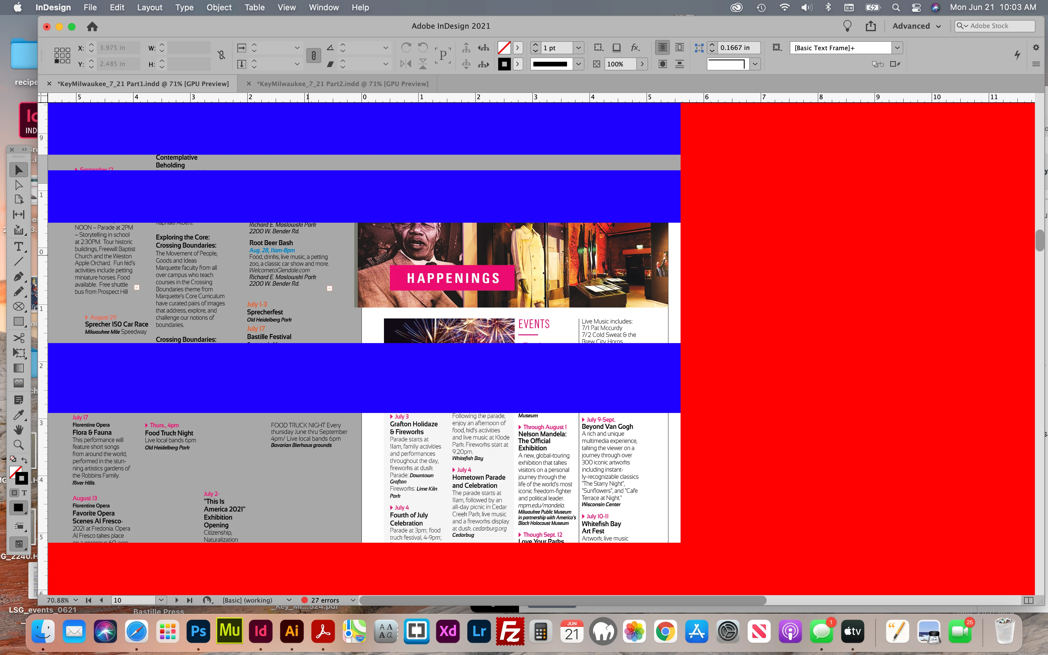 I'm having an issue with InDesign where solid blue or red bars suddenly appear on my document across the entire width of the window. At the same time these suddenly appear I'm not able to select text frames or edit them. To fix the problem I exit out of the document and re-open it. Sometimes this fixes it completely and other times the same problem occurs again within a couple of minutes. It happens across all documents - not just one. Anyone else having this issue? I have tried rebooting/restarting my computer and that doesn't fix it for long - just a temporary fix.