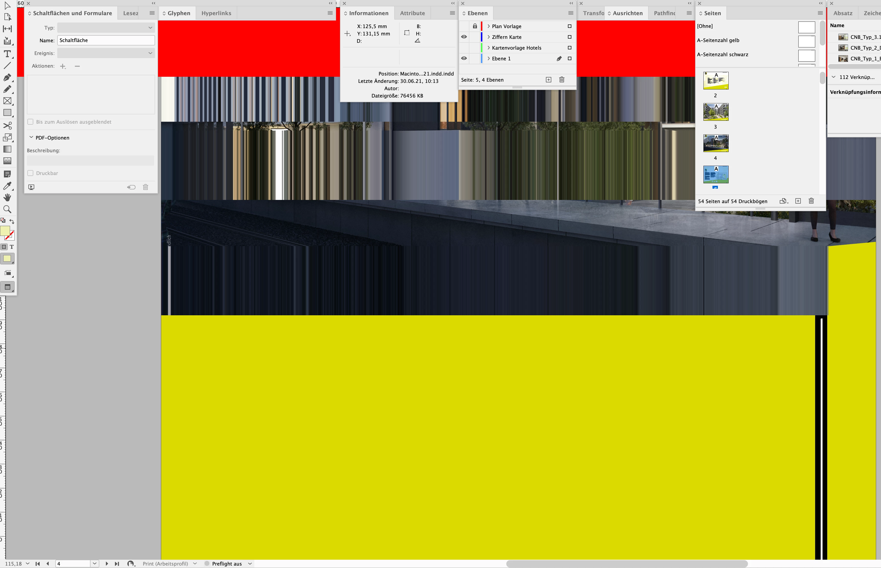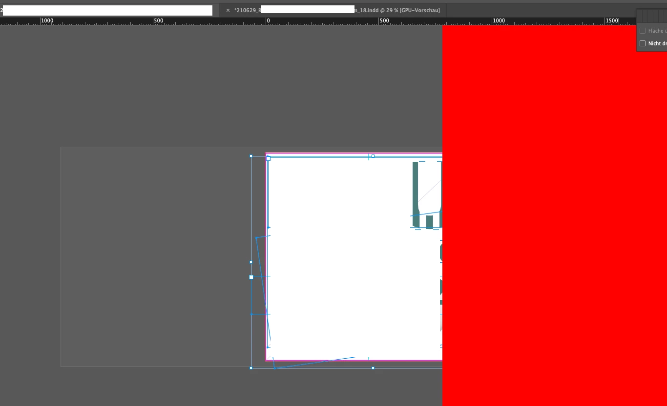 Since a few weeks, I've got big problems working with InDesign. Whilst working, it often has display problems showing the content – I have big red colour background areas/boxes (as seen on top of the screenshot), other coloured areas in my document enlarge whilst scrolling or show errows (see screenshot), and in this case I also can't activate items like text boxes and others correctly with my cursor anymore.