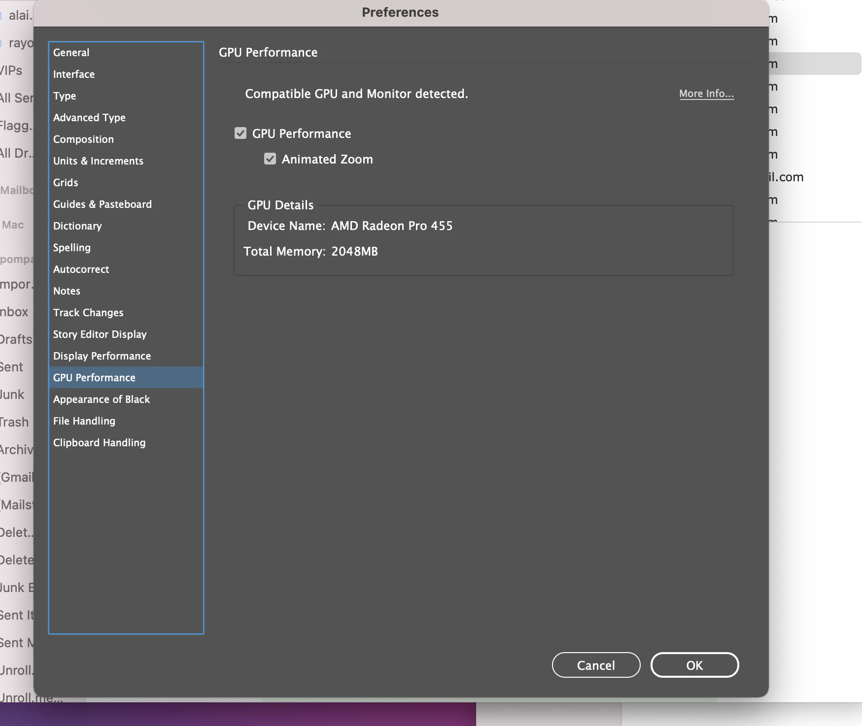 • Screenshot of the “GPU Performance” from InDesign > Preferences >  GPU Performance like this: