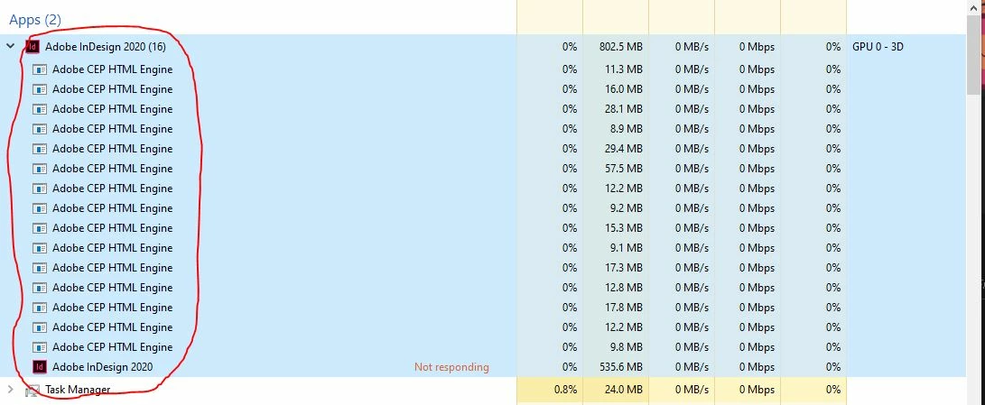 Adobe Indesign 2020 does not succesfully open, instead it freezes upon reaching the recents page. When exploring the task manager it shows the attached image. Tried finding a solution to this but it only seems to affect photoshop from what I have see, therefore the options to fix are not the same. Please assist, thank you.