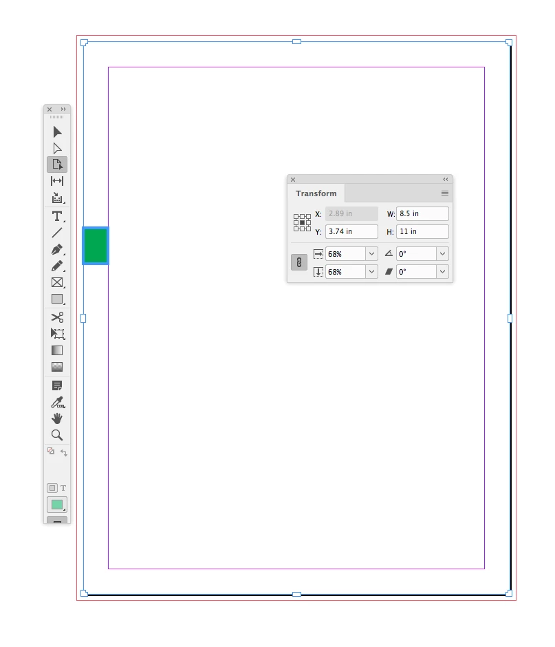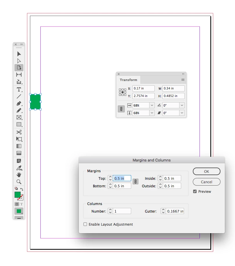 I have a new document, and I set the margins to .5" all around. However, in reality the margins are at .34". I know this because the green box has a width of .34" (see screen capture).