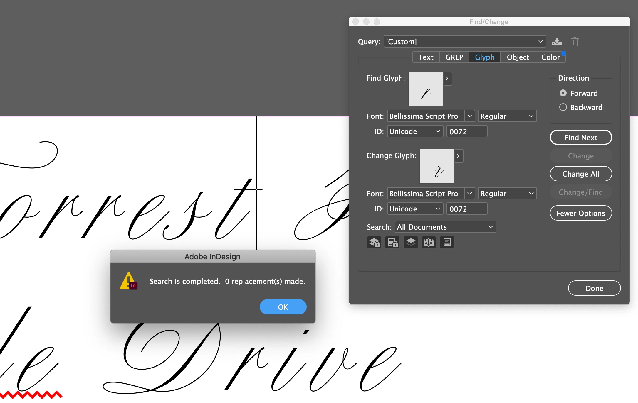 I've tried selecting the glyph I want to change and choosing "Load Selected Glyph in Find" to make sure I have the correct one in the document that I want to replace. I've set my search to all documents, but when I choose the different version of the glyph I want to change to and click "Change All", I get a message that the search is complete and no replacements have been made.