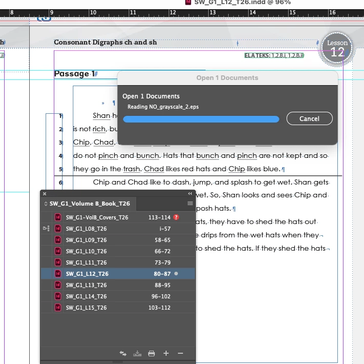 I’m now having issues where I’ll open a doc from the Book panel and the doc opens but a modal box stays up saying “Open 1 documents” and typically hangs showing the name of a placed image. Of course, as with everything CC, the “Cancel” button never actually cancels. I can’t do anything but Force Quit and then the fun of having InDesign say files may be damaged.