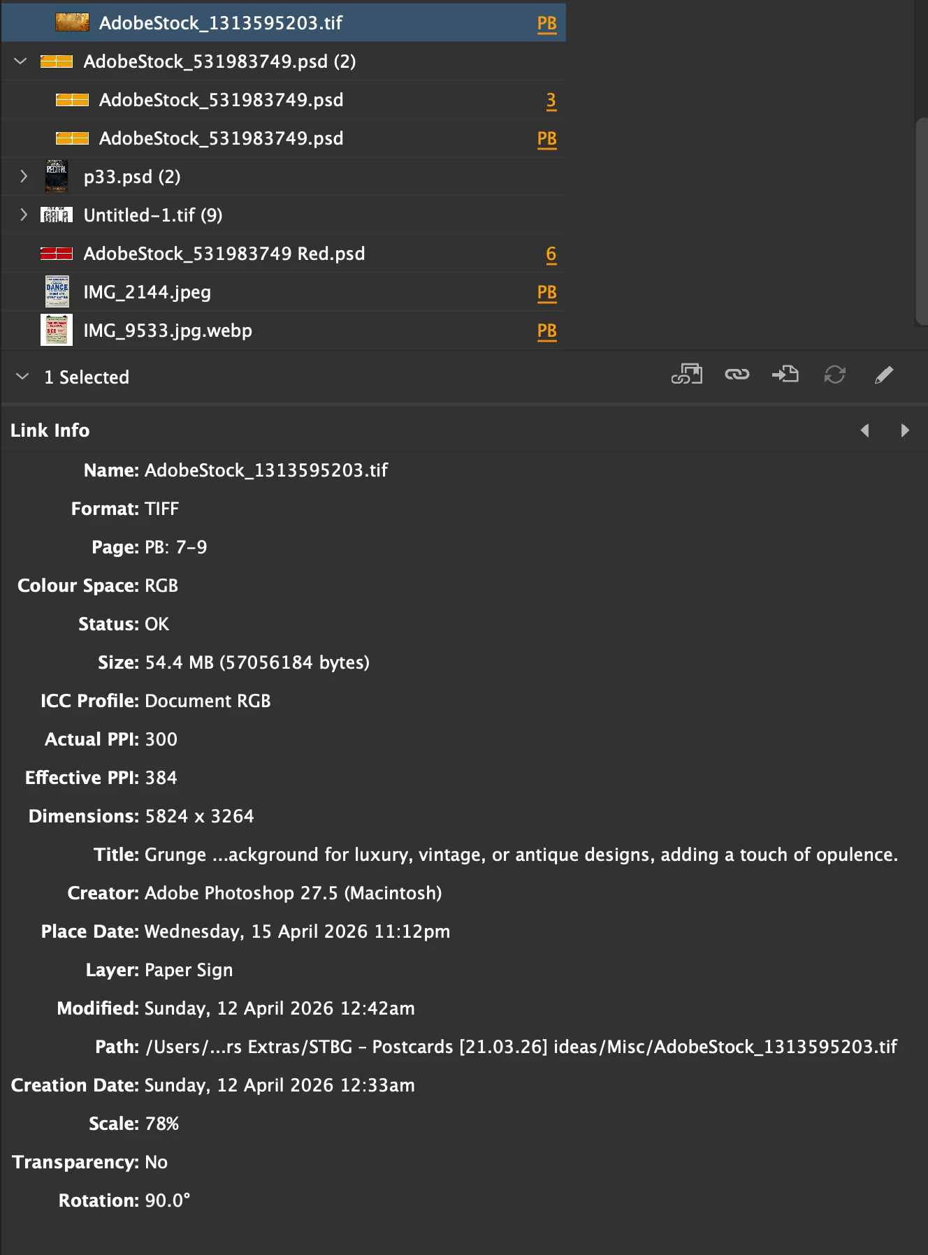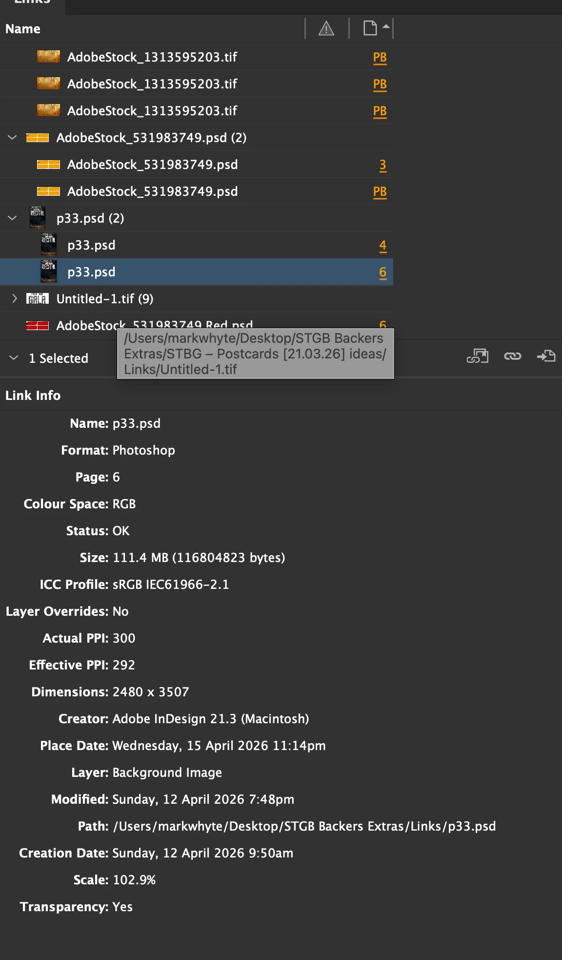 In the same document, all linked files — stored locally on the Mac with no network, external drives, or cloud sync involved — must be manually relinked at the start of every working session. The Links panel incorrectly reports these links as valid between sessions, masking the underlying problem.