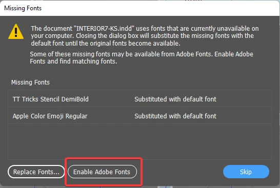 Every time I open the project I click on the "Enable Adobe Fonts" button at the bottom of the Missing Fonts window that pops up. (If you can see the attached image, those are not the Adobe Fonts that are missing.
