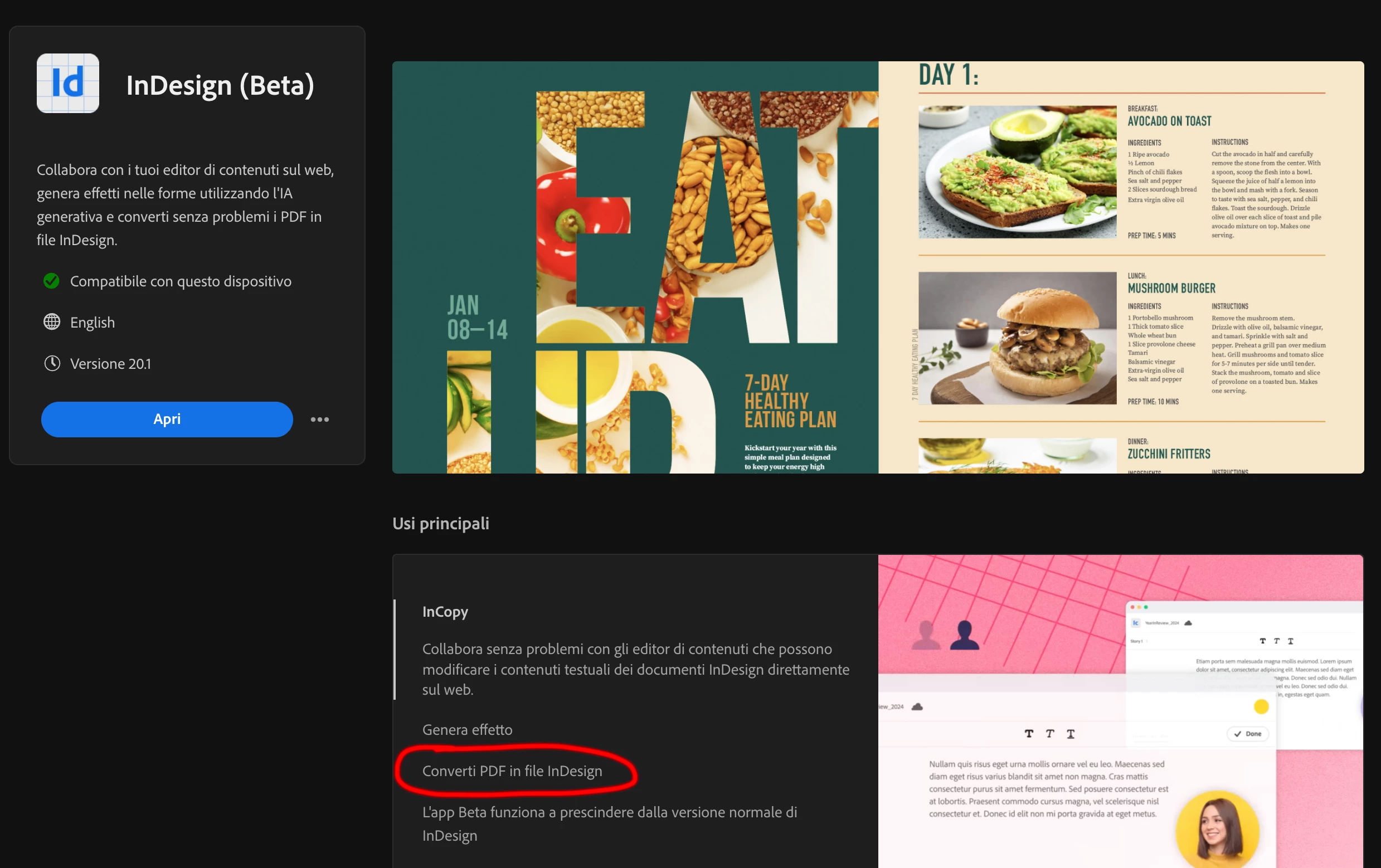 Indesign Beta è descritto come "converti pdf in file Indesign" ho scaricato la Beta 20.1 ma questo non funziona. Come mai non riesco ad prire i file pdf in indesign? C'è anche una pagina con un breve video che mostra come si fa. Seguo gli stessi passaggi eppure non accade nulla. Indesign Beta per ora è una delusione.