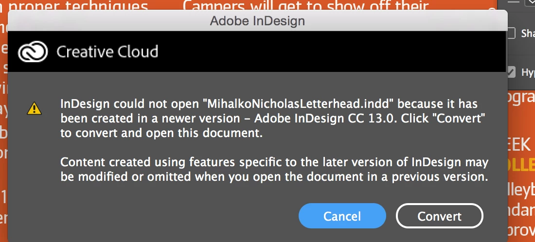 Indesign CC2017 won't open "newer" files