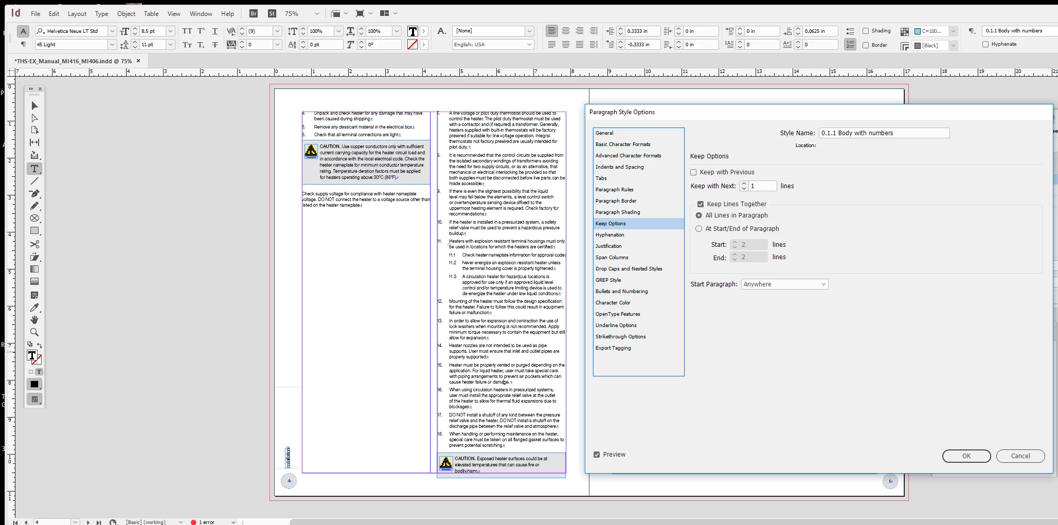 I'm really under a time crunch and I can't seem to figure out what the issue is.... I have set the keep on the paragraphs to "Keep All Lines in Paragraph Together" but lines are still breaking. The text is supposed to keep flowing in the same left column, but I really don't know know what's going on. I have other files using the same paragraph styles, so I've imported them and replaced all the styles in this file. It still won't go away and it's just this file with the issue... Does someone know what might be going on? How can i fix this?
