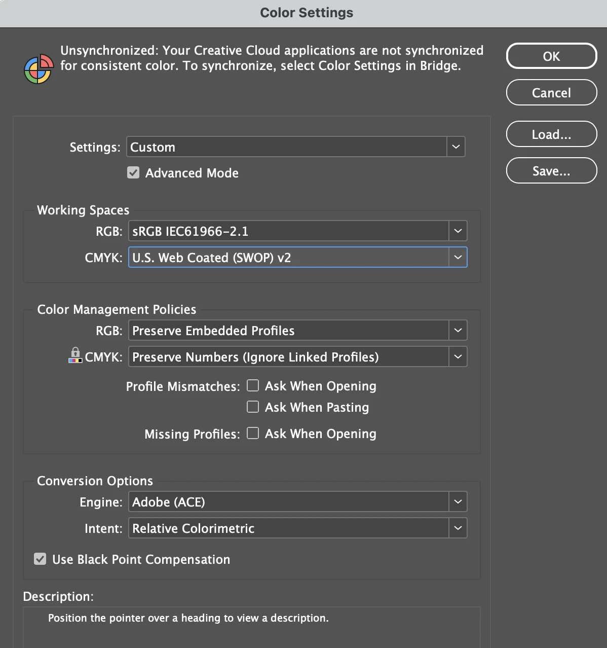 Admittedly I find the Color Settings in InDesign to be more than a little overwhelming. Attached are my color settings below.
