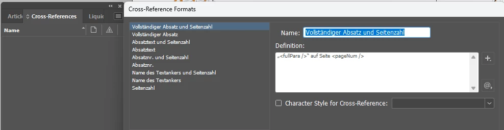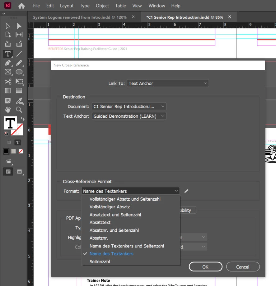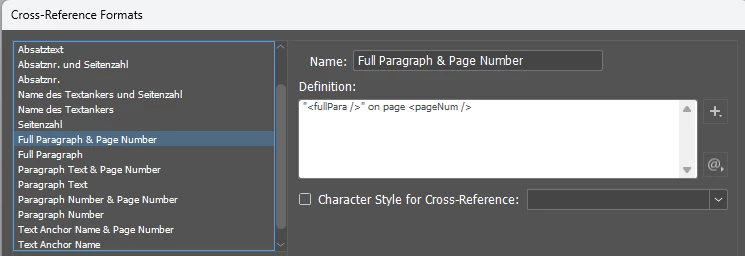 I have a really unusual issue, and I was wondering if anyone here had run into this before. I am using Adobe InDesign 2021, and trying to use the Cross Reference function. The process itself works fine. My issue occurs with the Cross Reference Format. The format selections are all in a foreign language. I was able to set up the reference, and the text itself is in English, as that is the language my InDesign is set too. However, the reference is formatted following the punctuation rules of the foreign language- so the quotes do not follow English formatting. I cannot find how to change the options for this dropdown, and every language option I can find are all set to English. I have even uninstalled and reinstalled InDesign, with no change. A co-worker does not have this issue. Image capture below.