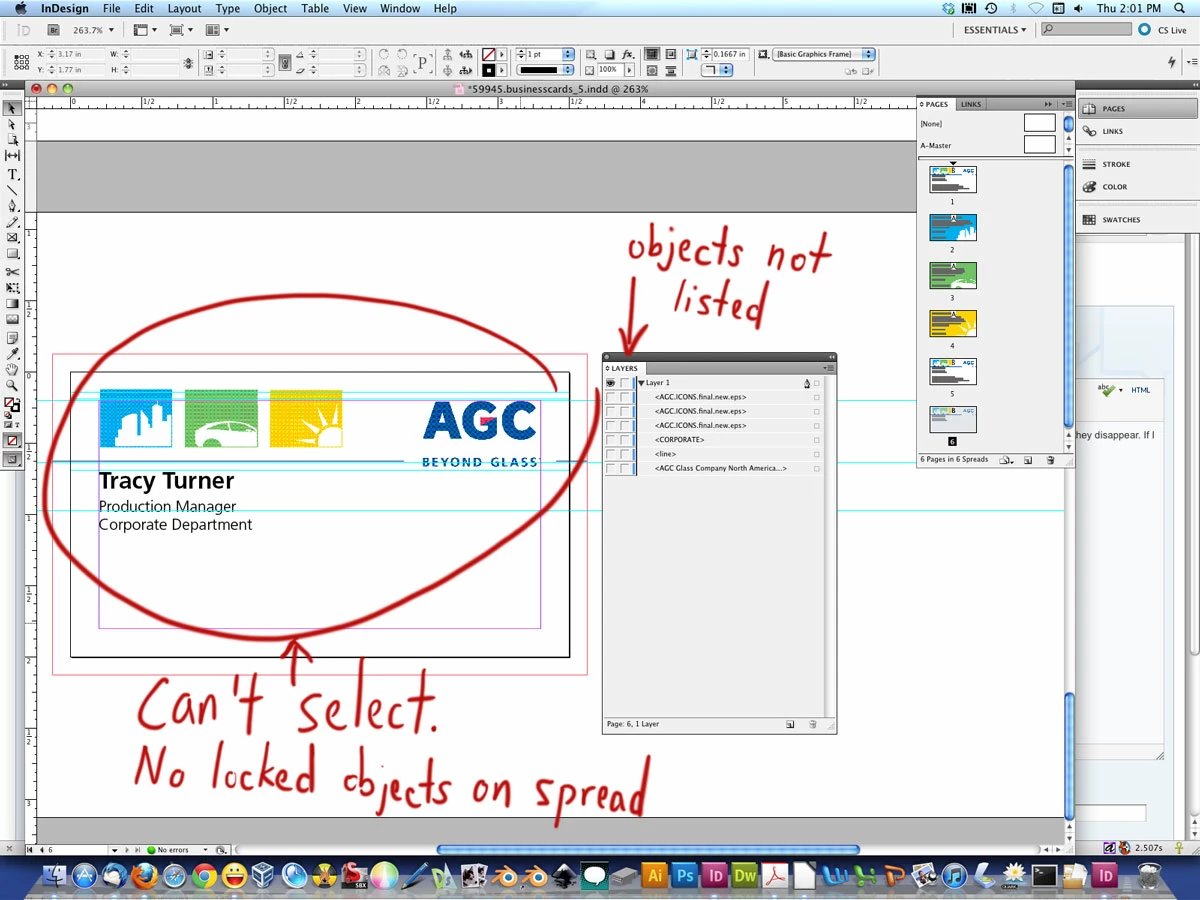 Indesign CS5.5 can't select objects, they don't show in layers panel either
