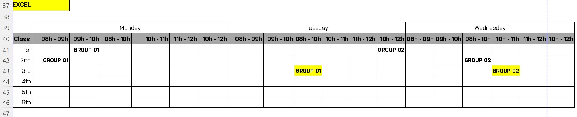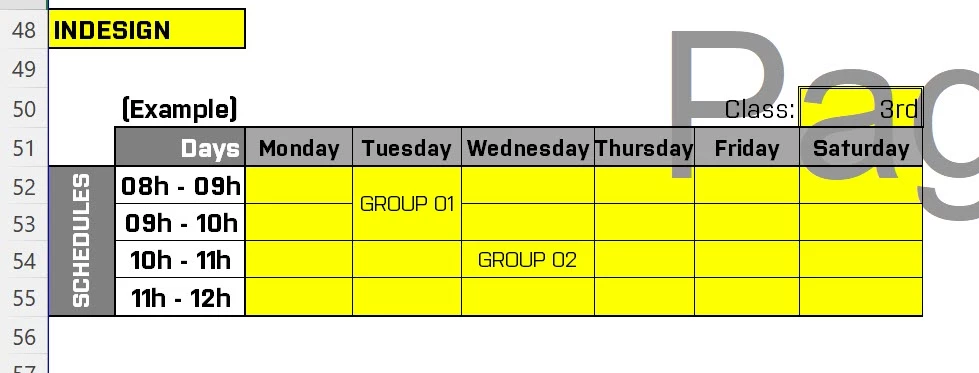 2- Schedules (8h to 9h, 9h-10h, 8h-10h (sometimes for merged cells) , 10h-11h, 11h-12h, 10h-12h (sometimes for merged cells))