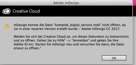 ich kann eine InDesign-Datei nicht öffnen. Es erscheint immer dieses Fenster: