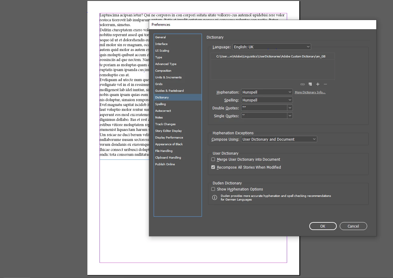 InDesign dictionary