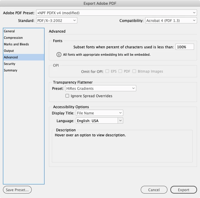 After a clean reinstall of InDesign today, I began the process of updating my settings and Workspace. But one setting isn't working the way it used to. InDesign > Edit > Transparency Flattener keeps reverting to [Low Resolution].