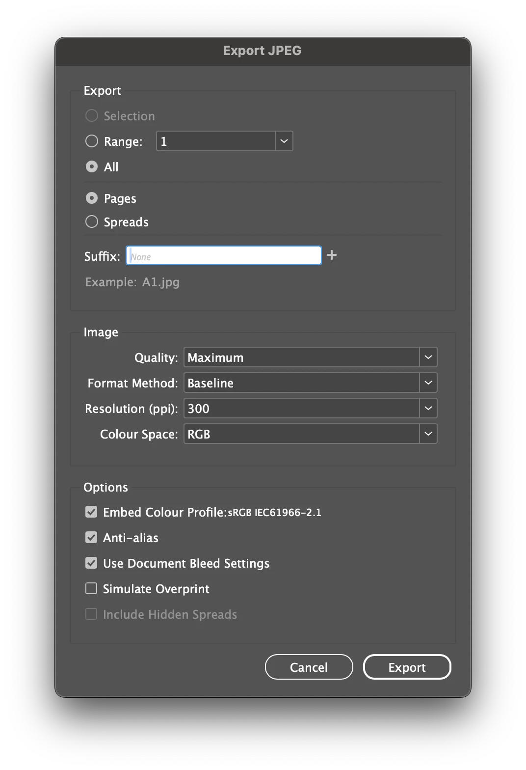 How can I write a JavaScript script for InDesign to export JPEGs while ensuring that any leftover text in the "Suffix" field from previous exports (e.g., "_^P" left after exporting pages) is cleared or replaced?