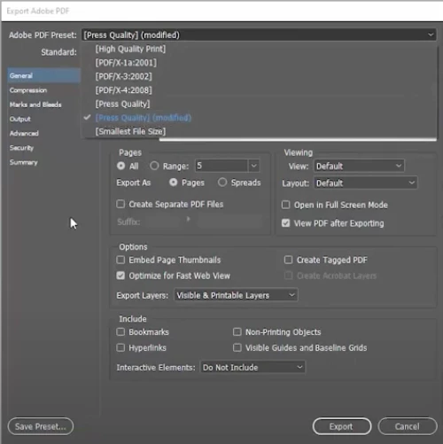 I want to export to PDF and change spread to pages. I used to get a detailed PDF Export dialog box (first image below), but now I just get the standard MacOS 'save as' dialog box (second image).
