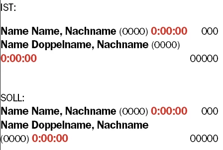 Hi, Ich möchte eine Liste erstellen, mit Name, Nachname, Startnummer in Klammern, Zeitangabe und Platzierung in einer Spalte von 39 mm. Gibt es eine Möglichkeit, dass die Zeile NACH der Startnummer umbricht, sobald NICHT alle Angaben in einer Zeile passen? Mit GREP?