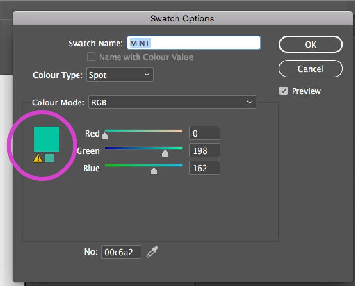 If I click the warning, the colour changes and looks better, but the HEX number changes to a different number to what I typed in, no longer matching my guidelines.