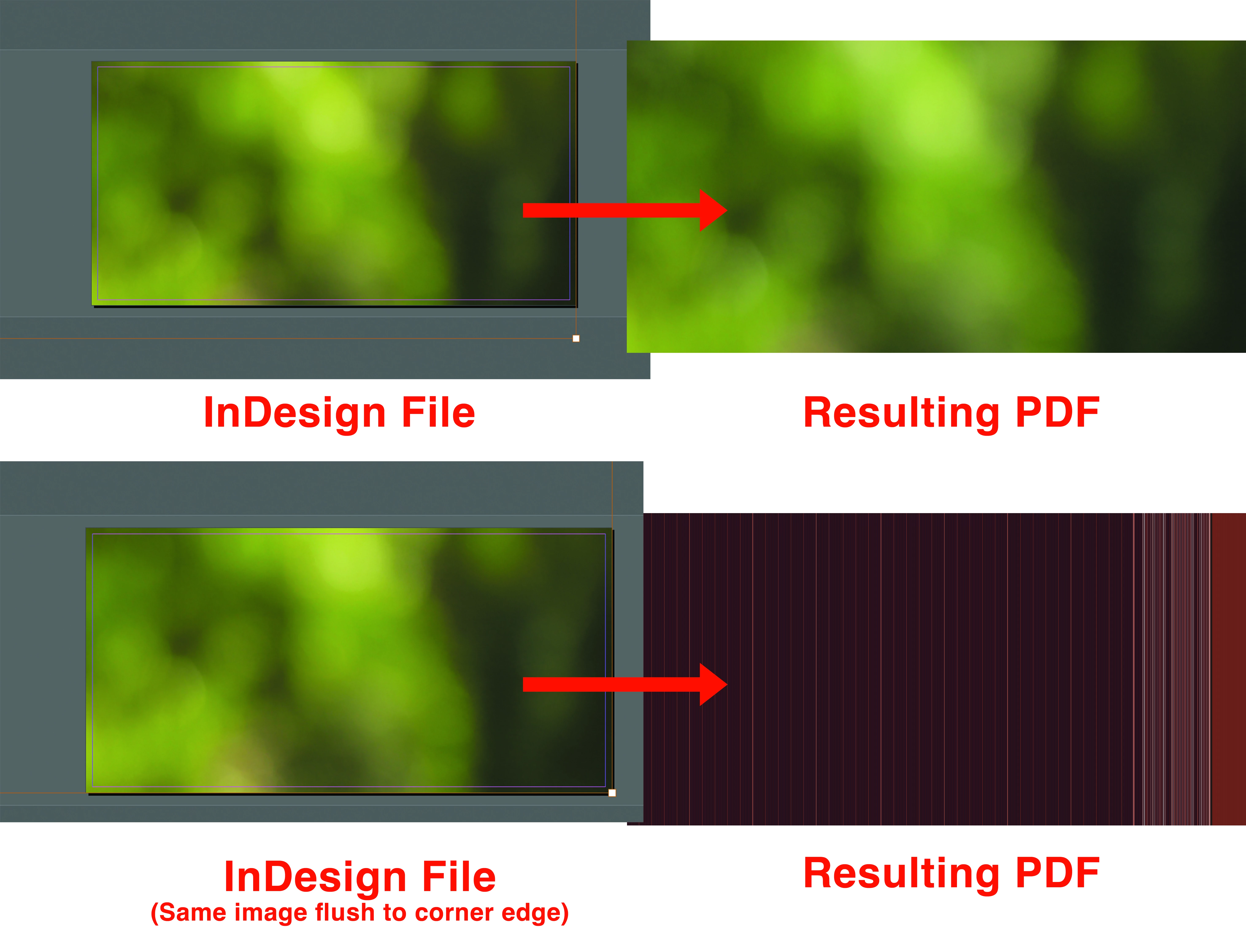 I have an InDesign print file with an image (.jpg file) within a frame which corrupts if placed at a certain position within the frame. If I place the bottom right of the image flush with the bottom right of the frame, the image corrupts when exported, however if I move the image even a couple of cm's off from being "flush" with the frame it exports successfully. I have attached an image to illusrate the issue I'm having. The image is clearly not corrupting unless it is flush with the edge of the frame which is very odd. I've never had anything like this happen. I am on the most up to date version of InDesign. I've tried different files at the same dimensions and have got the same result. Does anyone know why it is doing this and what I could do to fix it?