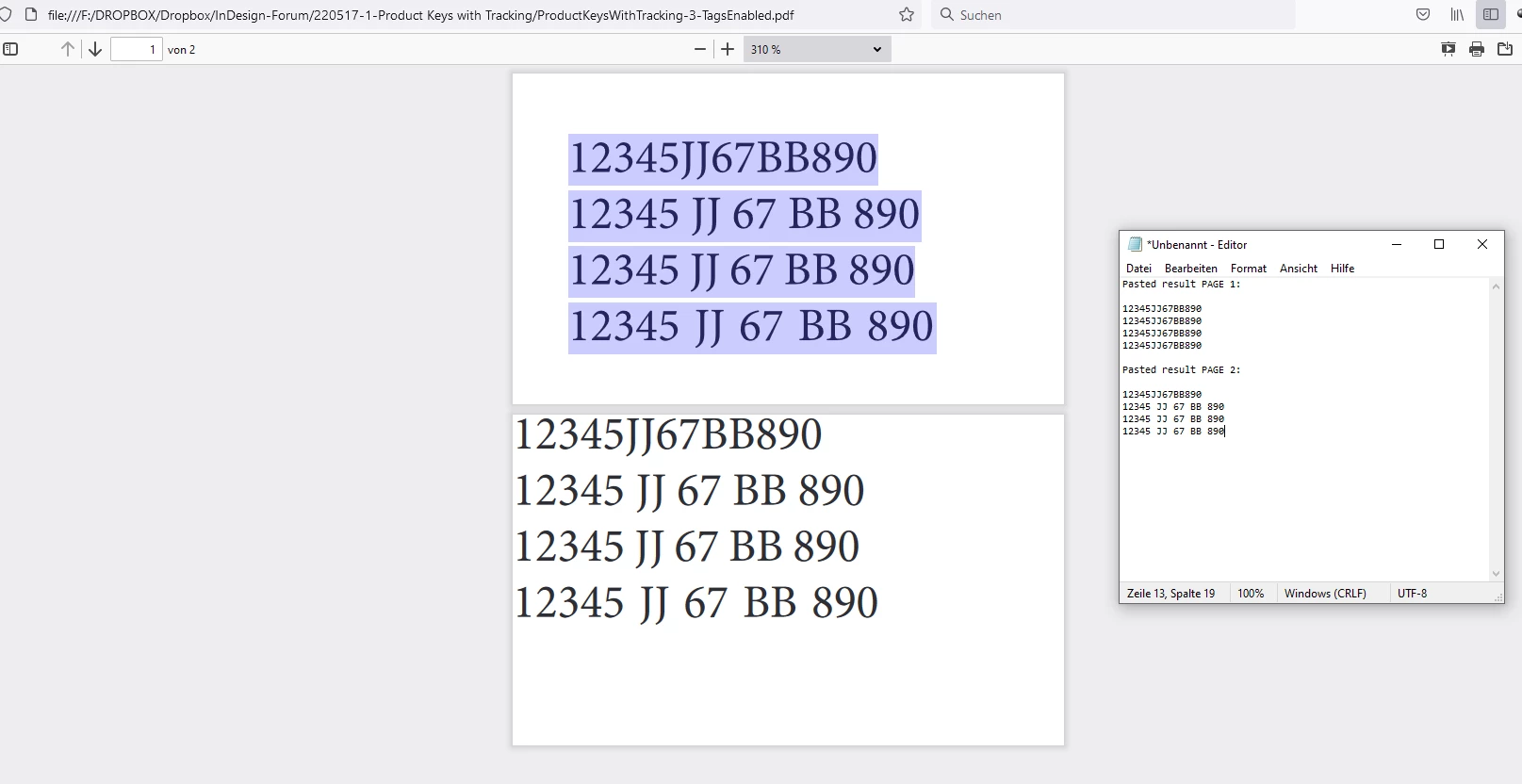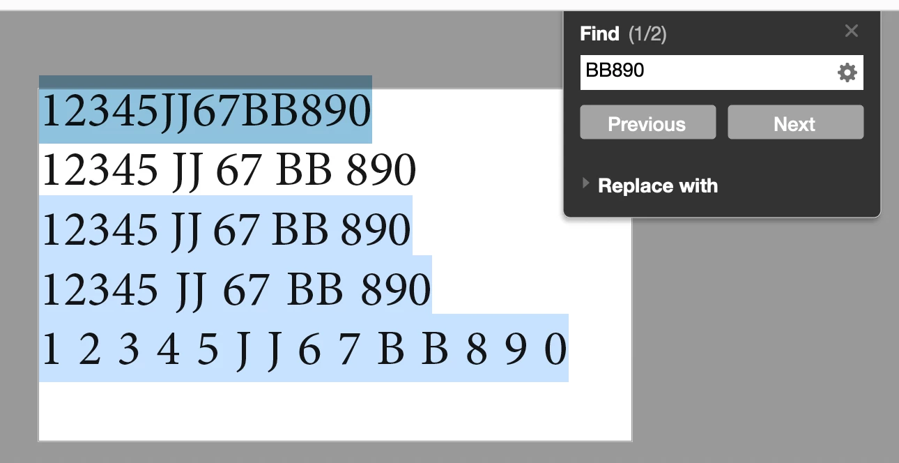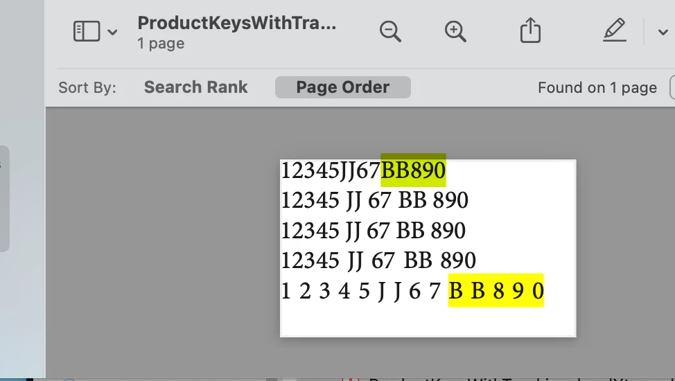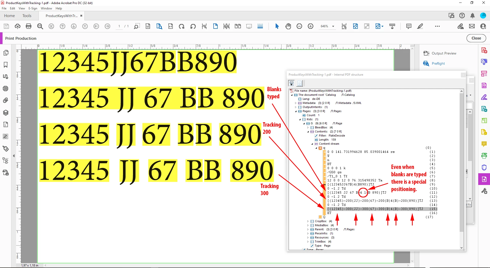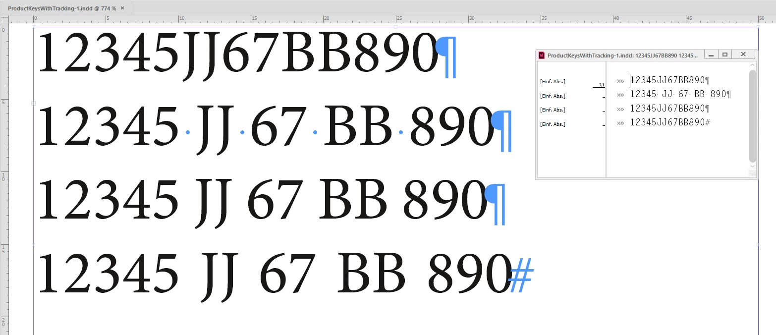 BUT if you export the document to PDF, the "fake" white space is converted to a "real" white space! So, if you try to search a code by typing "12345JJ67BB890" in the search field of Acrobat, it finds nothing. Becasue it really has a code with white spaces. You need to type it like this: "12345 JJ 67 BB 890". The same hapens if you want to copy a code from the PDF and search for it in the company product page: it finds nothing.