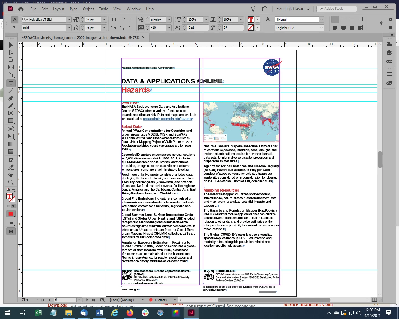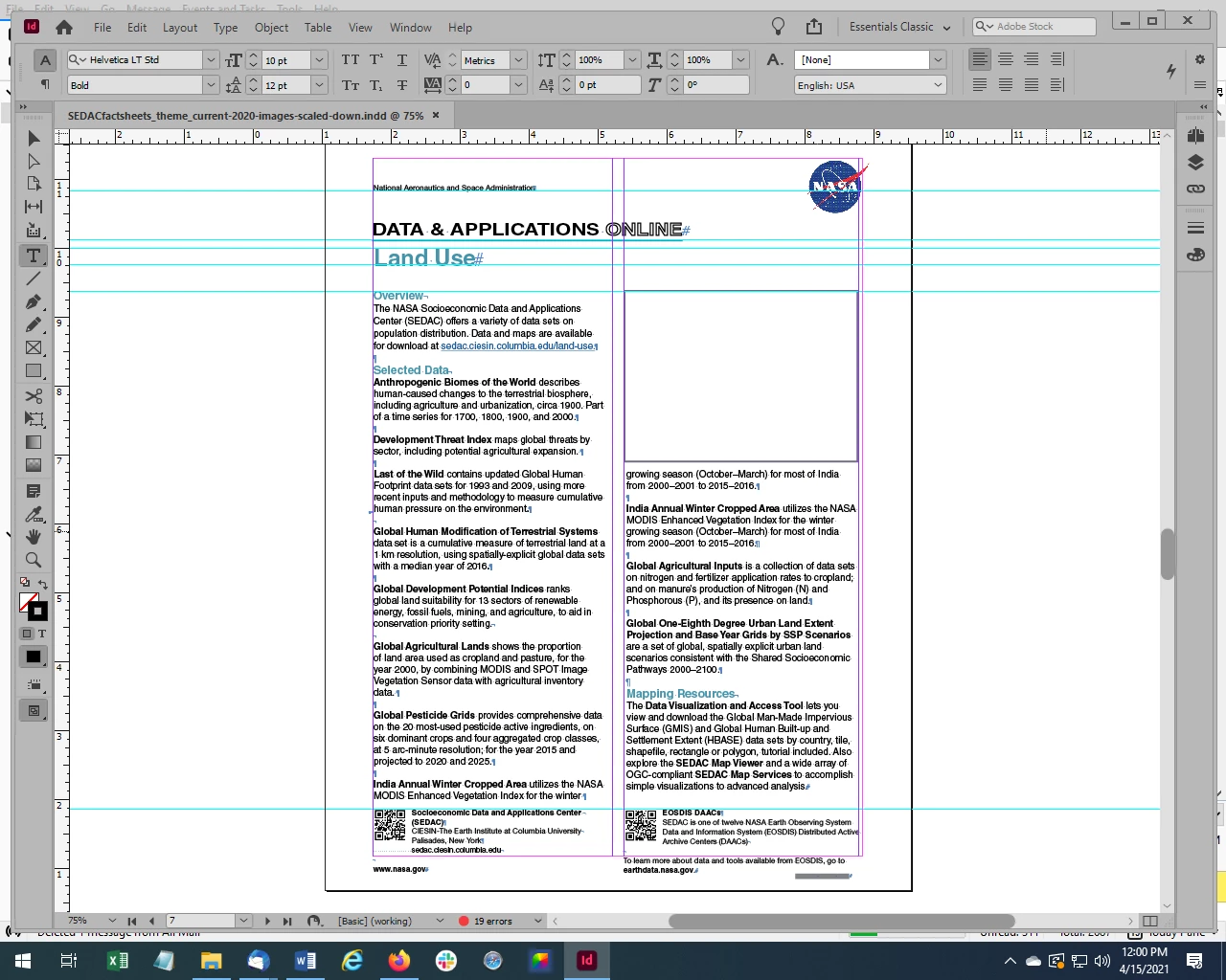 Line spacing between text blurbs is consistent on the page but inconsistent between the different pages. See screenshot "land Use" the line spacing is wider between paragraphs than in the screenshot "Hazards." In Hazards one paragraph return accomplishes a nice, tight line spacing but in :Land Use: I have to use two paragraph returns (just one does not give me a proper line break) but it's more than I want. If you compare the specs along the top of the page everything is the same (I think!). This file is also very old, probably ten years old. I've used the same file through all the updates. Now I've been asked to substantially change the sheets. My workflow is to copy a new page from the pages palette, copy the new text in notepad, then paste it in OR (since lots of text is repeated page to pate) copy and paste from one page to another. I have changed fonts a few times, now settled on Helvetica Lt Std throughout, manually applying bold and copying the subheads. I don't use styles because I was never able to really learn it (I know, I know) but I'm not a graphic artist and it's challenging for me. Has anyone enountered this problem? Thank you!